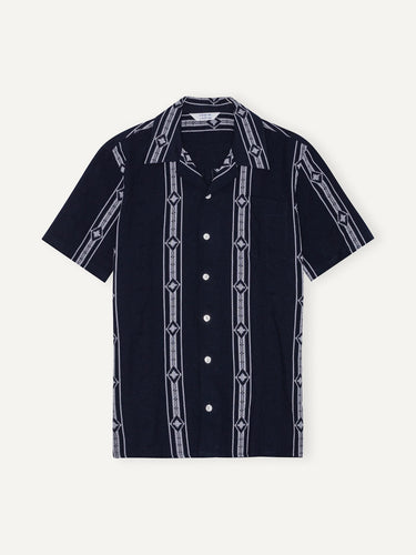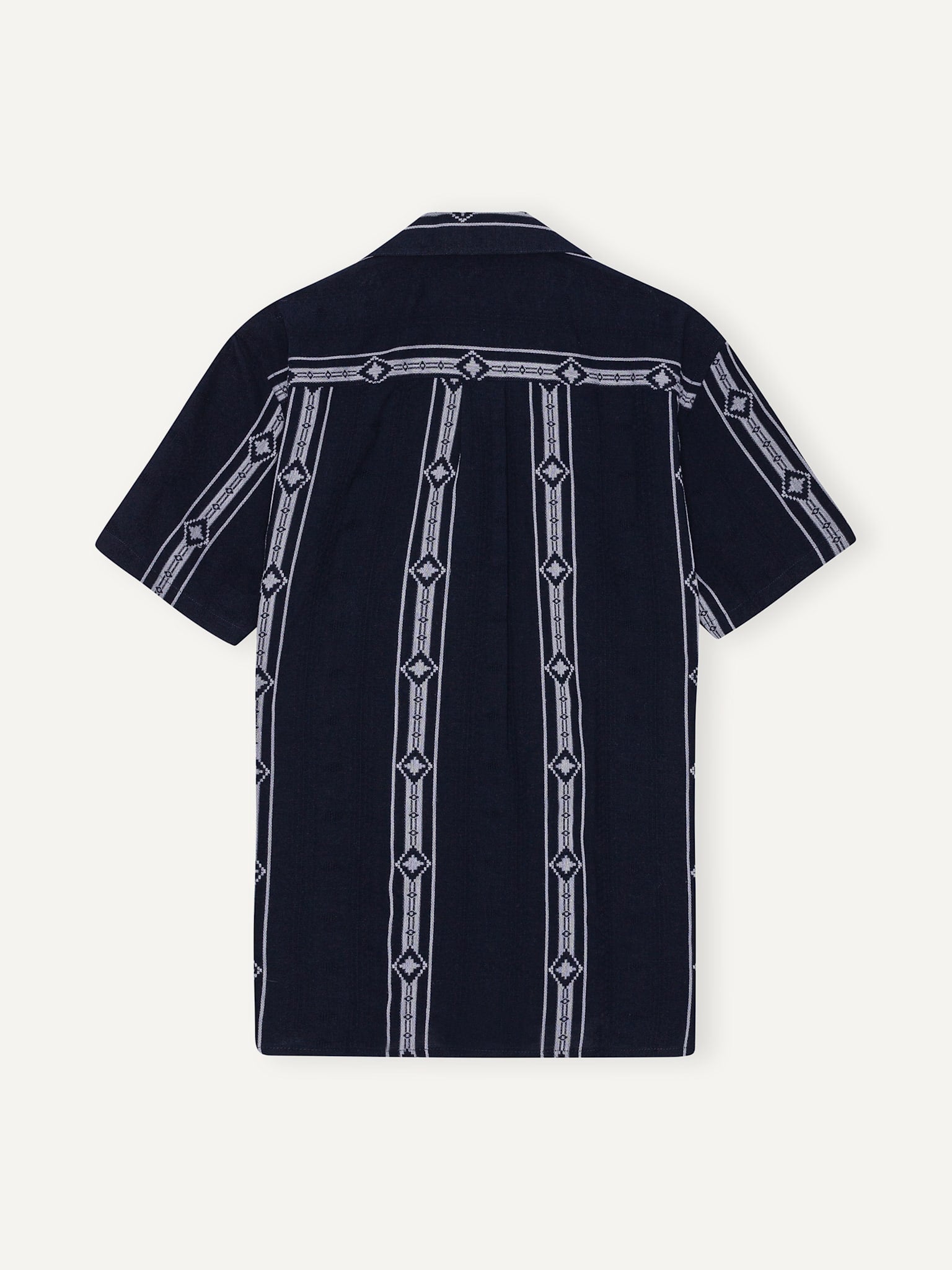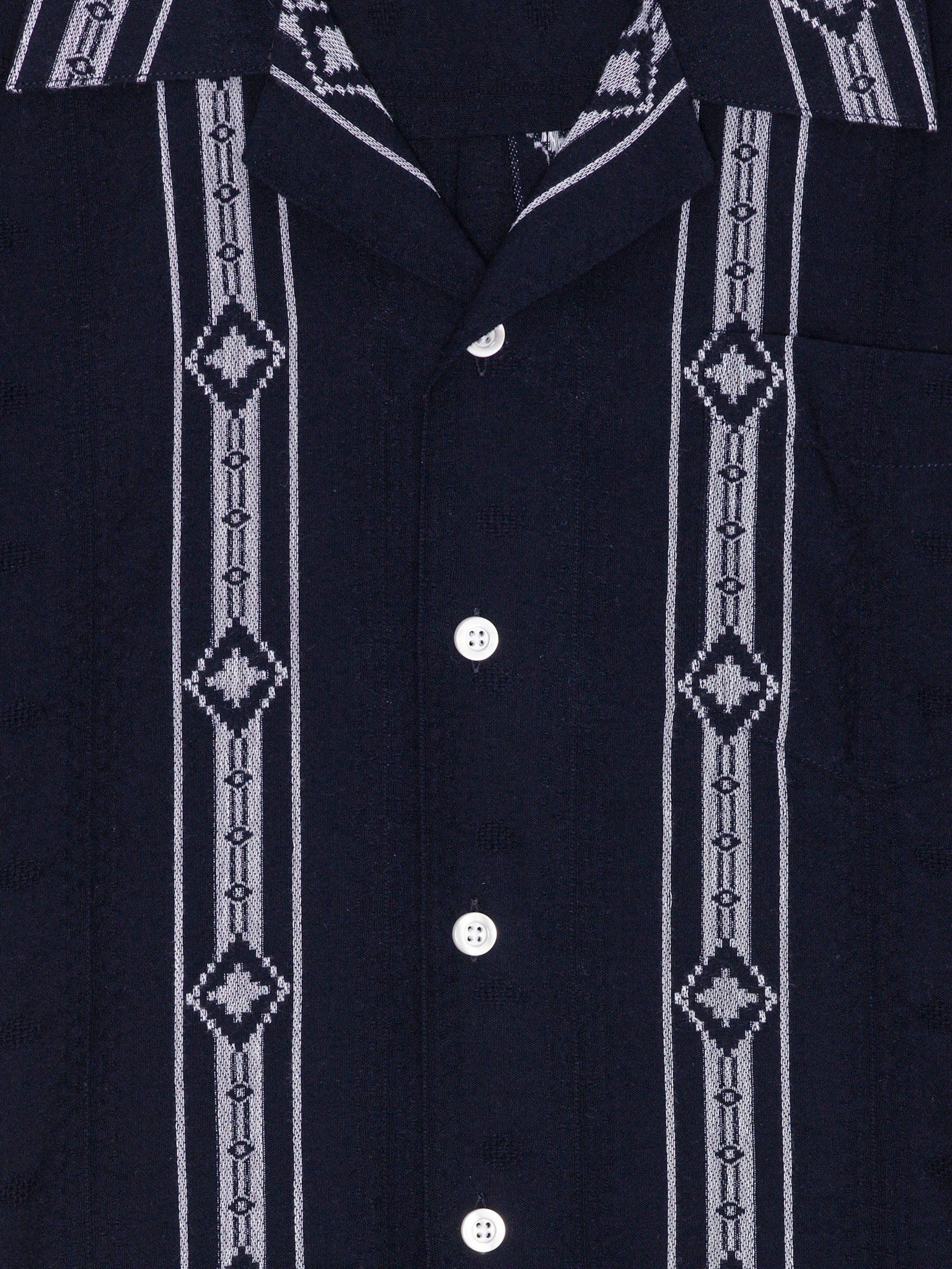 Cut from a jacquard weave with stripes. The Cave shirt is our classic short sleeve shirt with camp collar and a chest pocket.