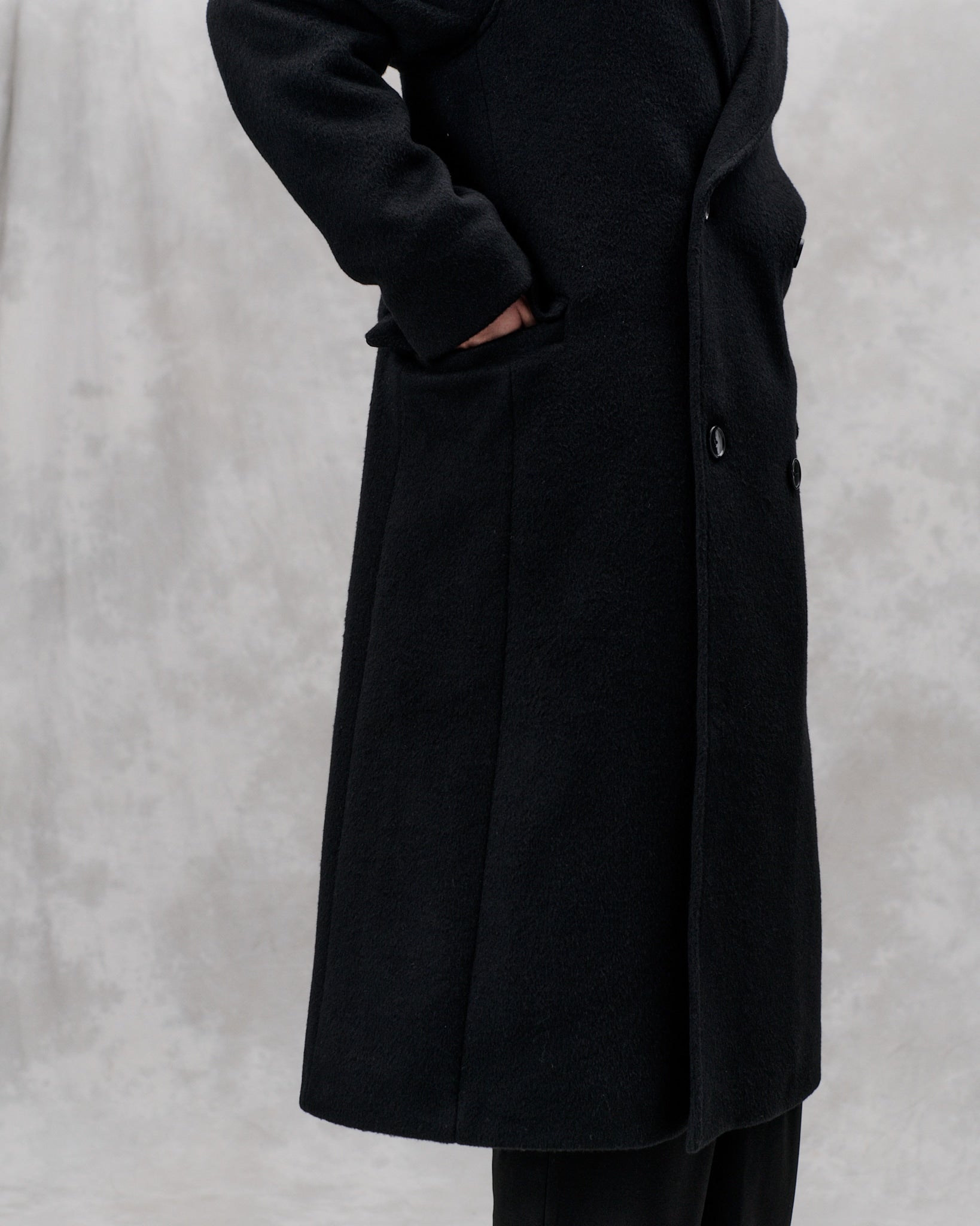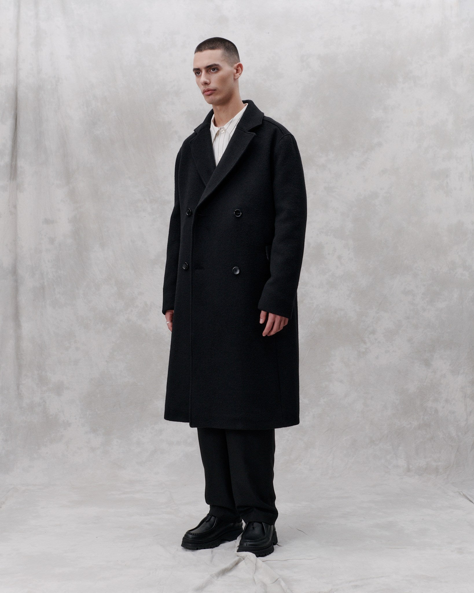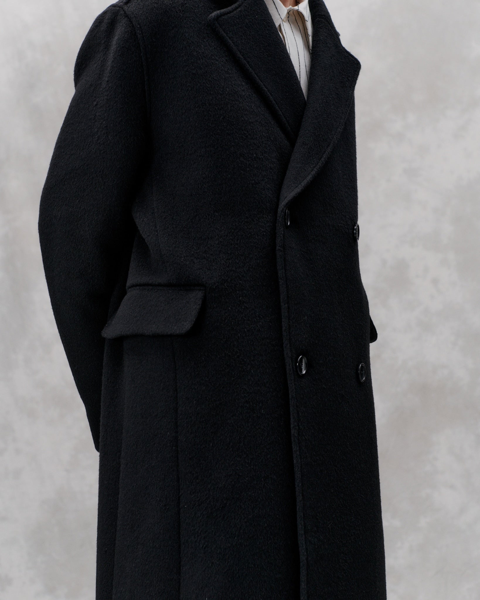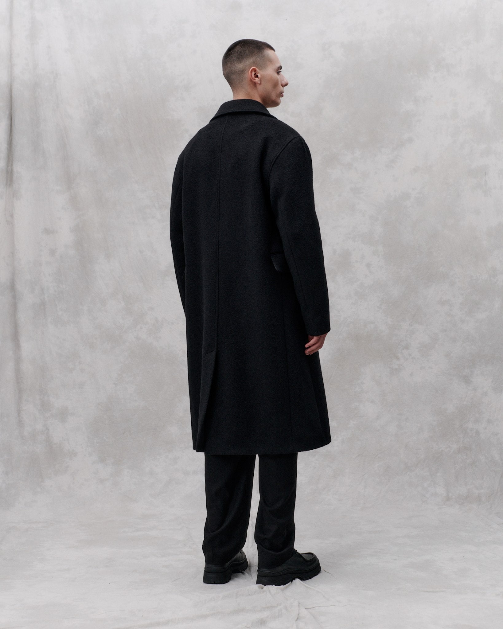 Contemporary tailoring for versatile use. This formal classic cut coat is made from an Italian brushed heavy wool and is a classic libertine-libertine staple. Features a slightly a-shape with a dropped shoulder, slanted velt pockets and a high center back slit. The coat is cut below the knee-length, fully lined and featured with MEIDA thermo insulation.