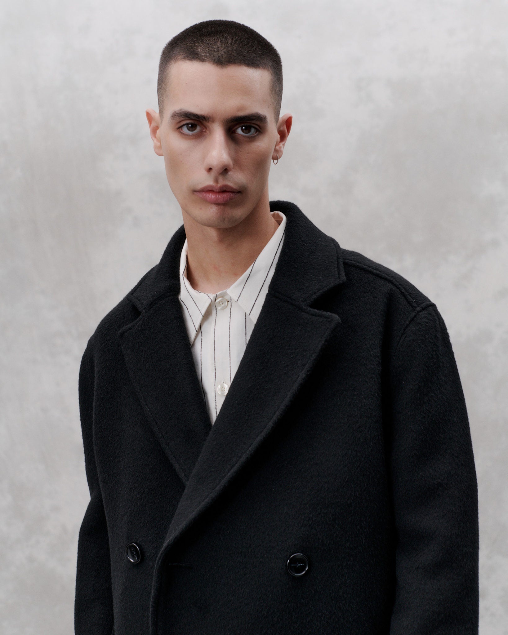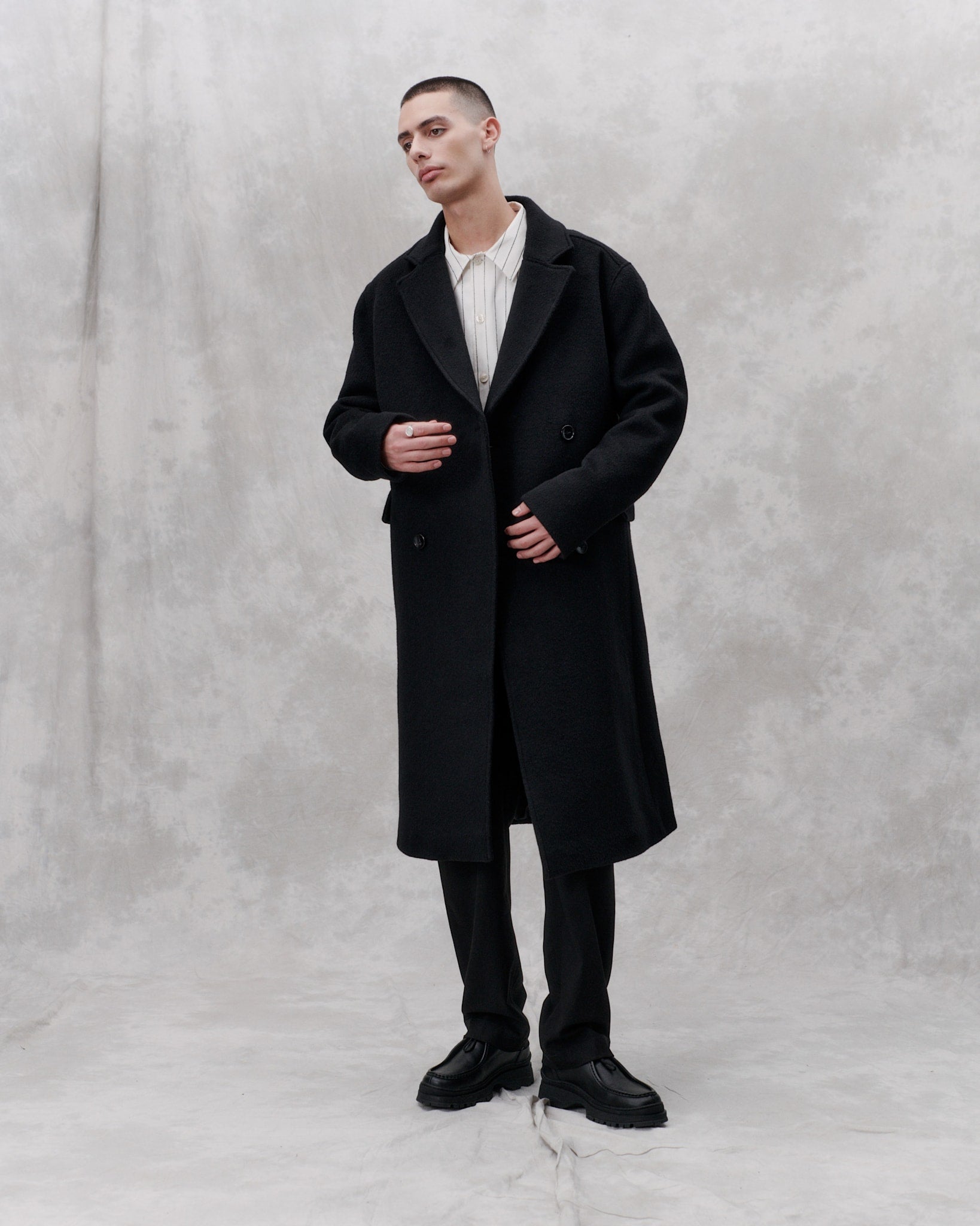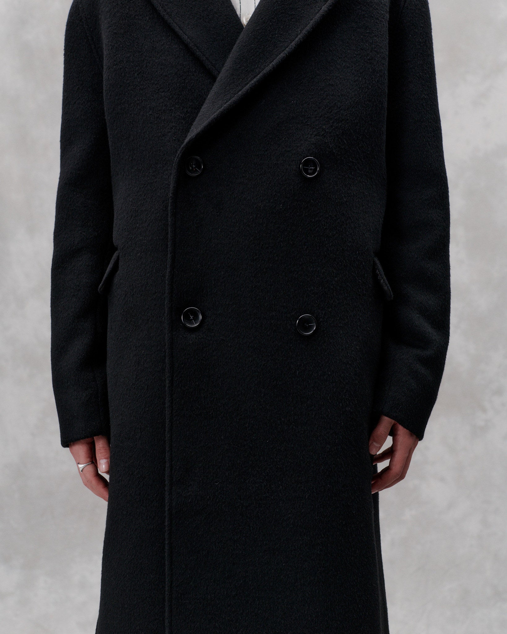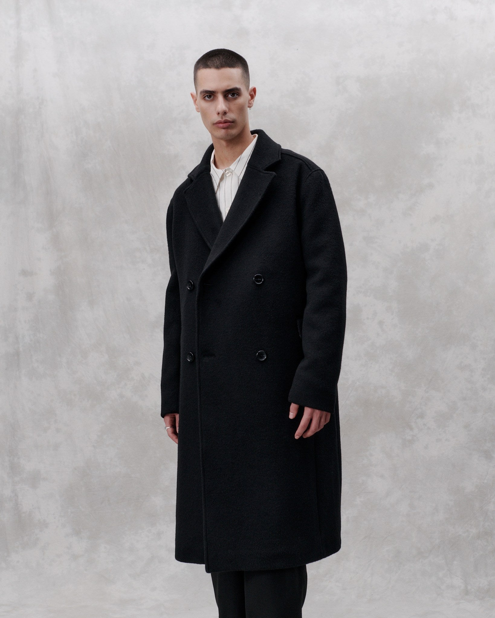 Contemporary tailoring for versatile use. This formal classic cut coat is made from an Italian brushed heavy wool and is a classic libertine-libertine staple. Features a slightly a-shape with a dropped shoulder, slanted velt pockets and a high center back slit. The coat is cut below the knee-length, fully lined and featured with MEIDA thermo insulation.