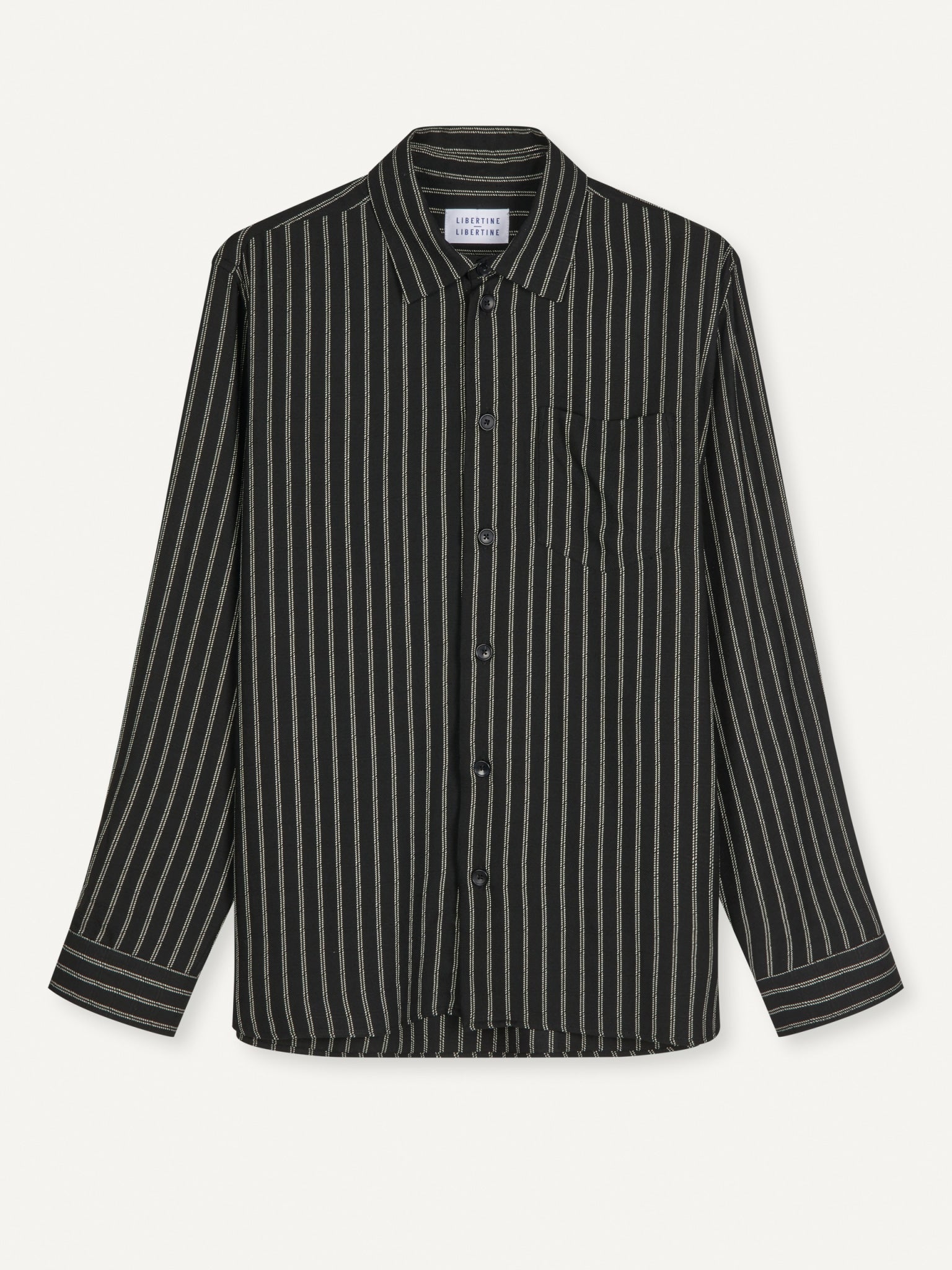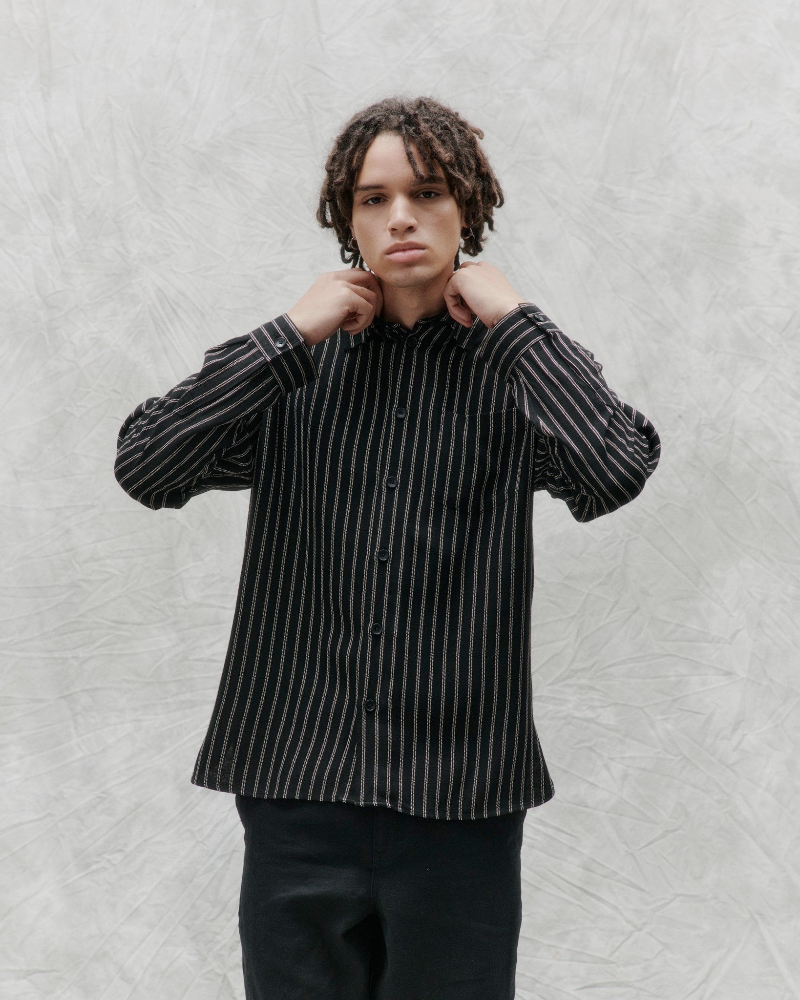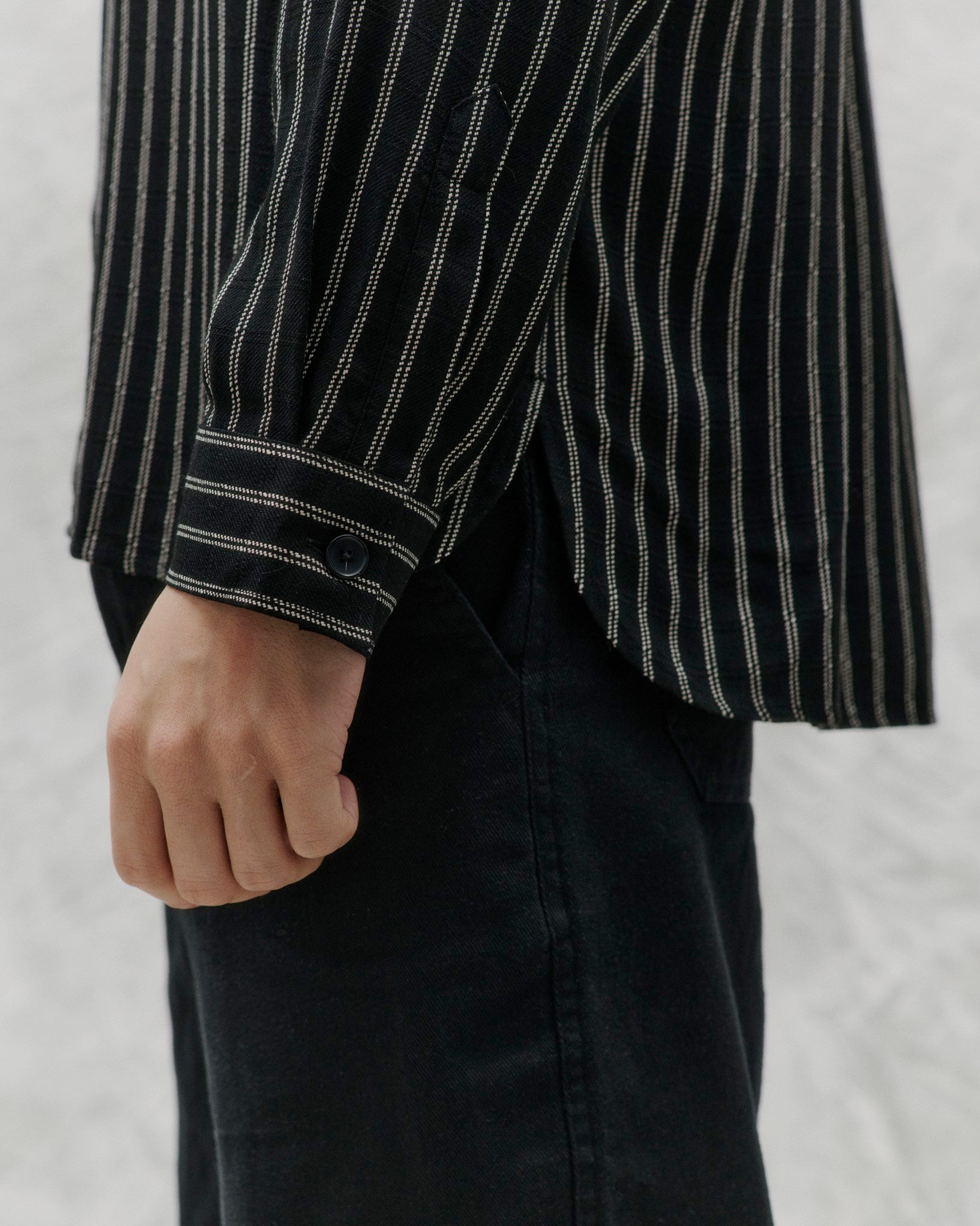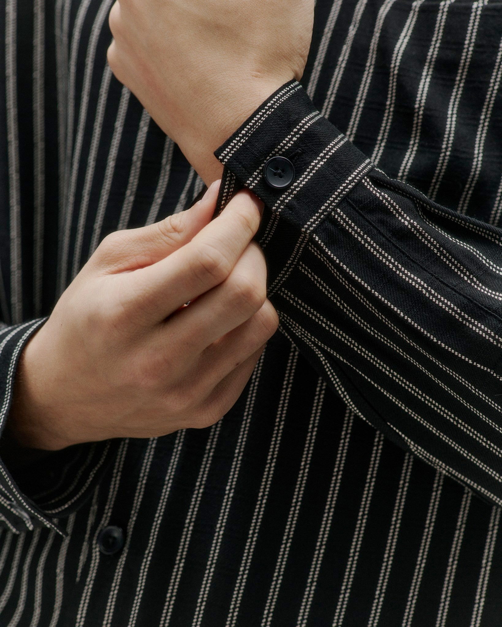 A clean generously fitted shirt with stich less placket and collar in light Italian pinstripe fabric. Button closure on placket and cuffs. This style is ideal for completing a laid back suit look.