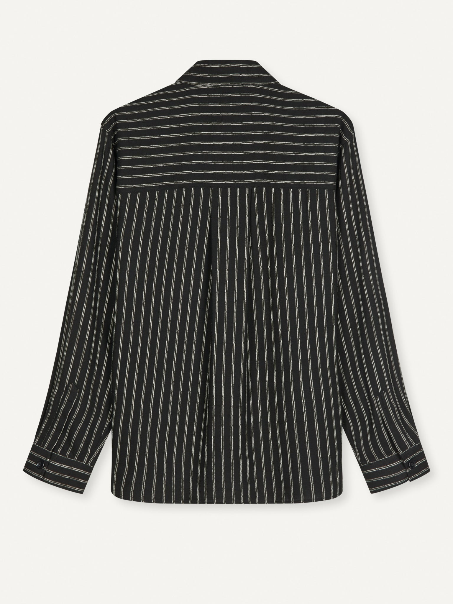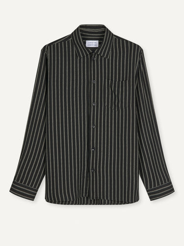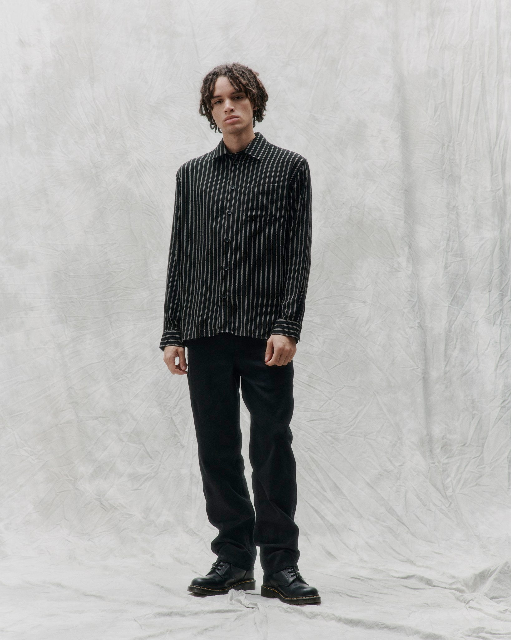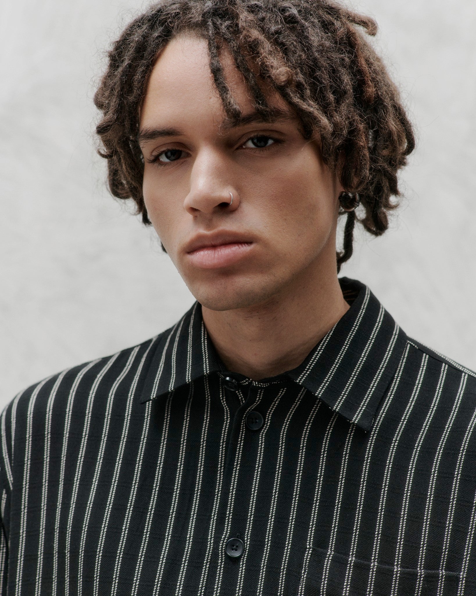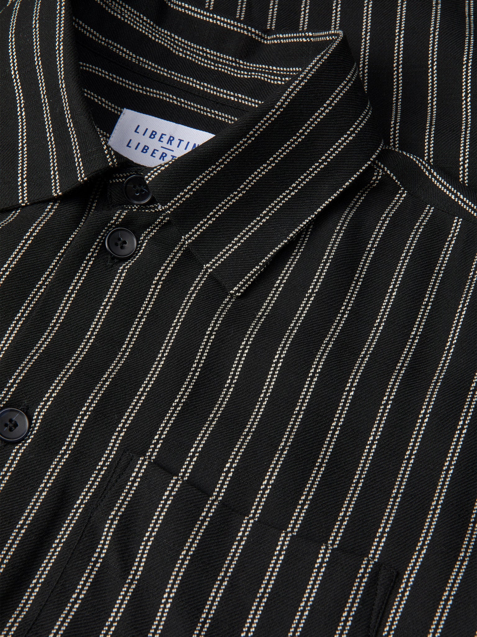 A clean generously fitted shirt with stich less placket and collar in light Italian pinstripe fabric. Button closure on placket and cuffs. This style is ideal for completing a laid back suit look.