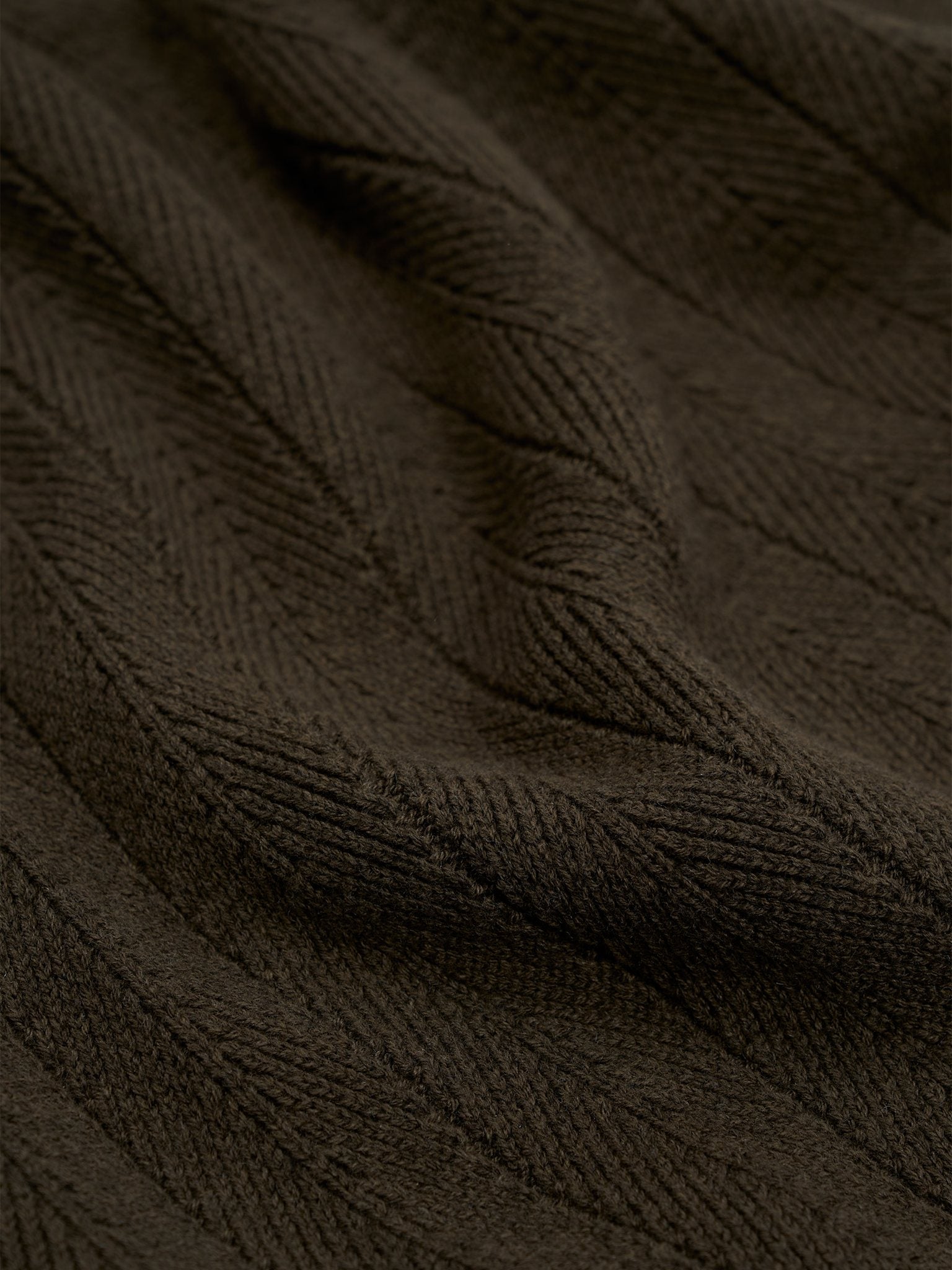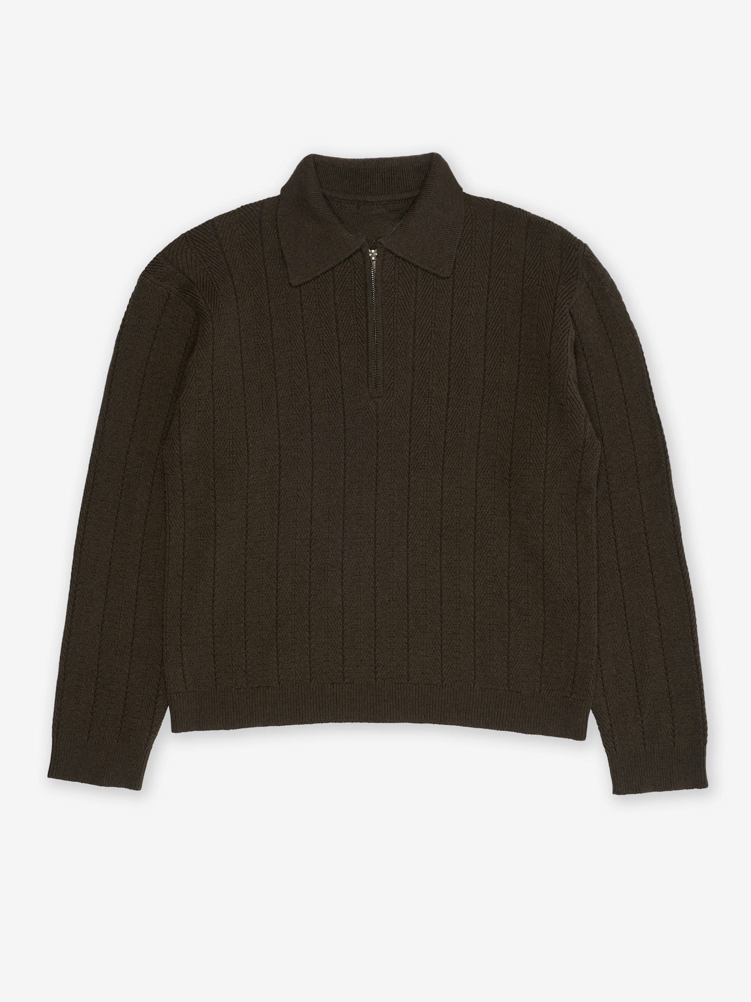 Scent is our 7GG half zip knit with a collar. Made in a structured herringbone stitch The Scent knit features ribbed sleeve and bottom hem for nice fit.