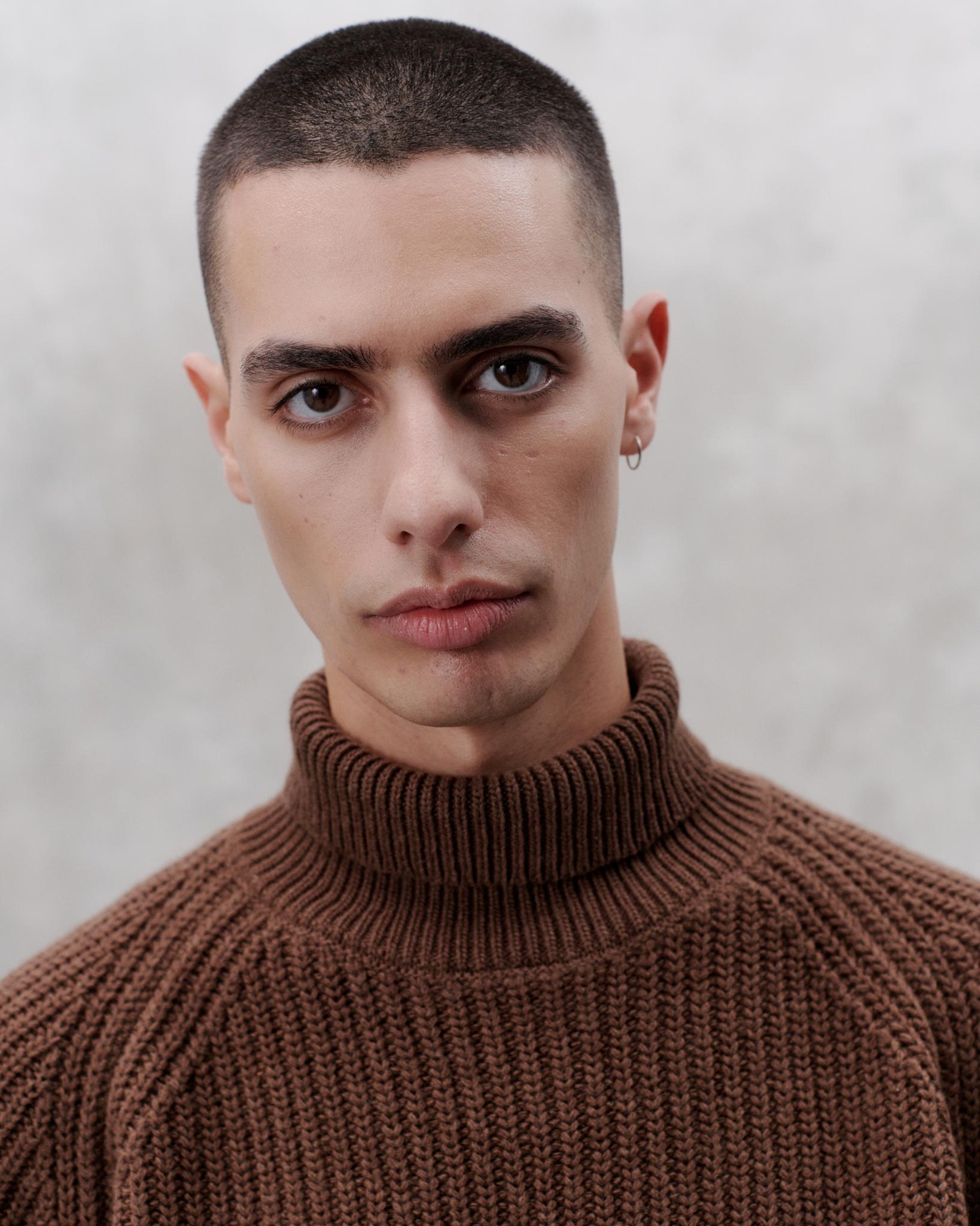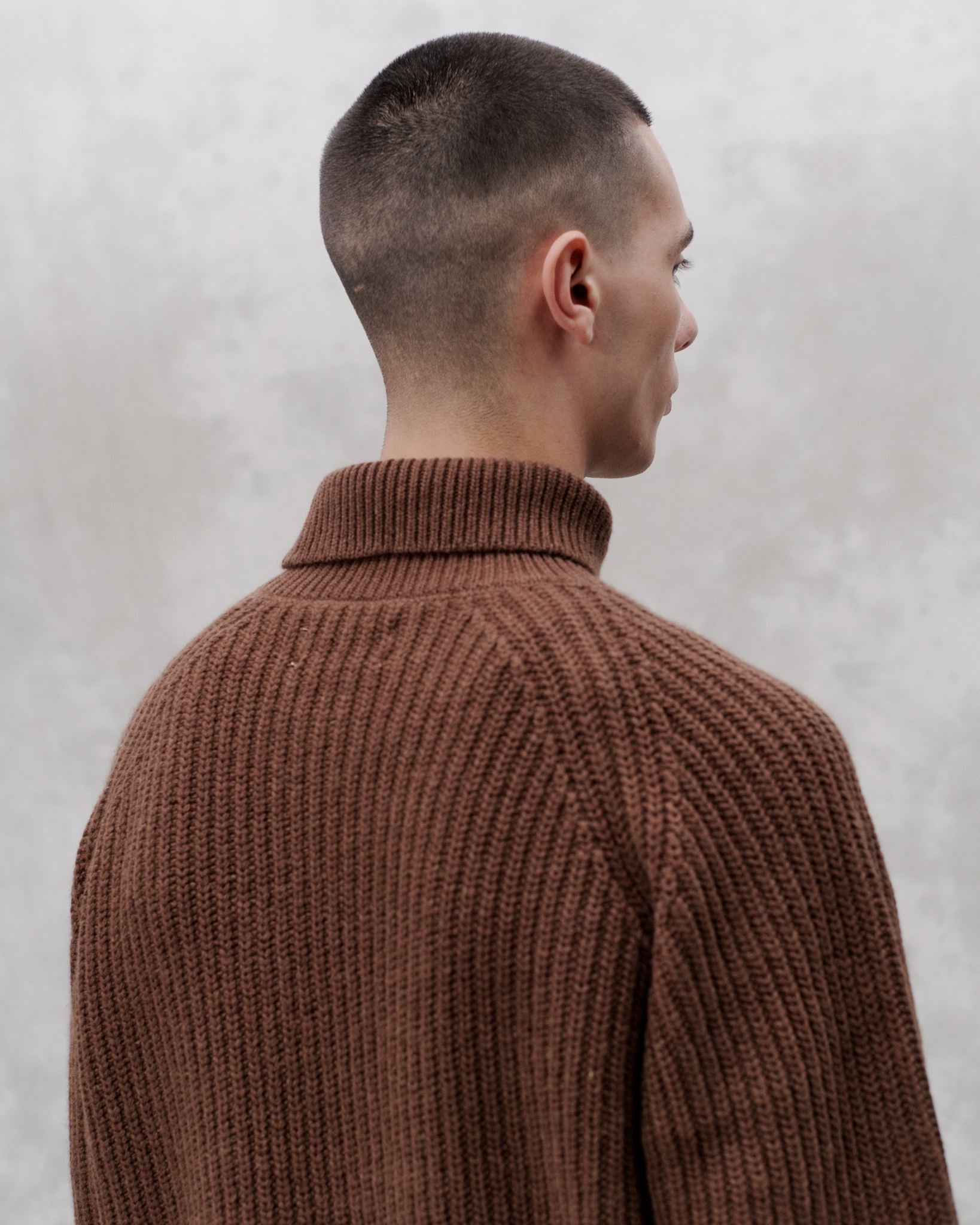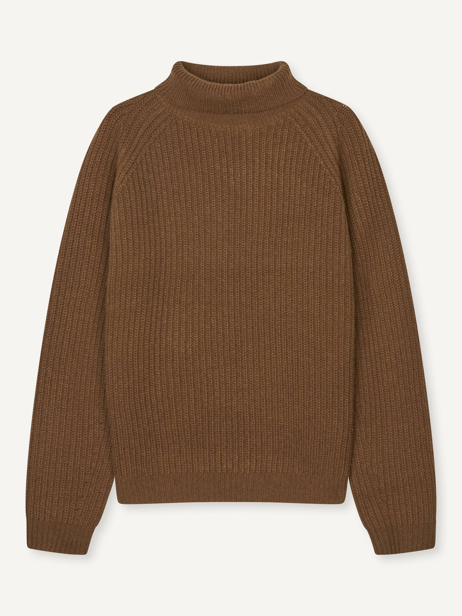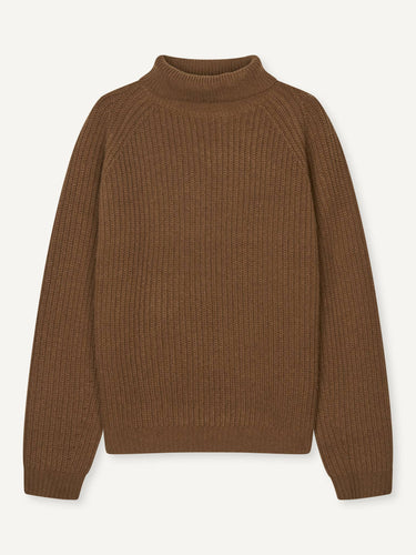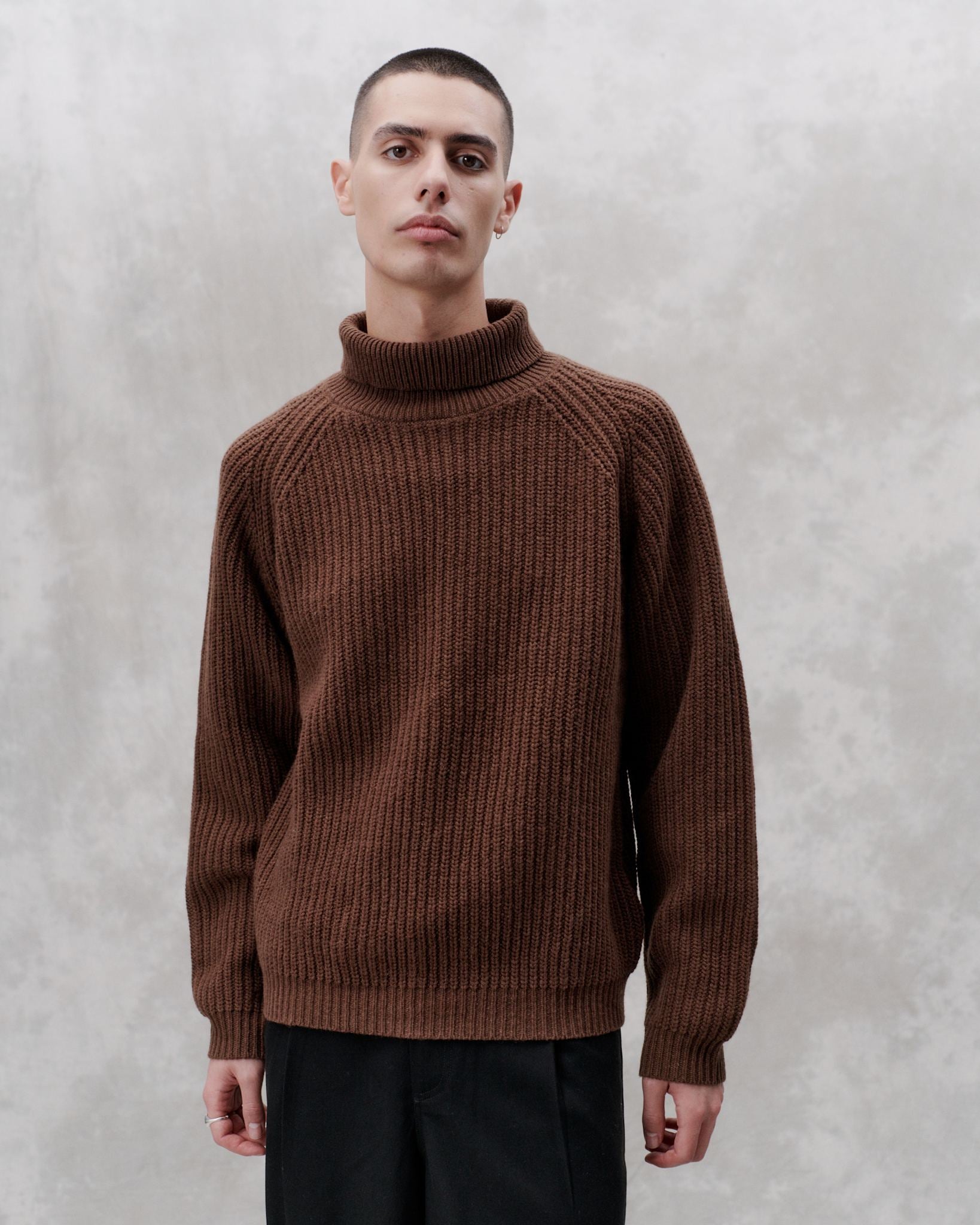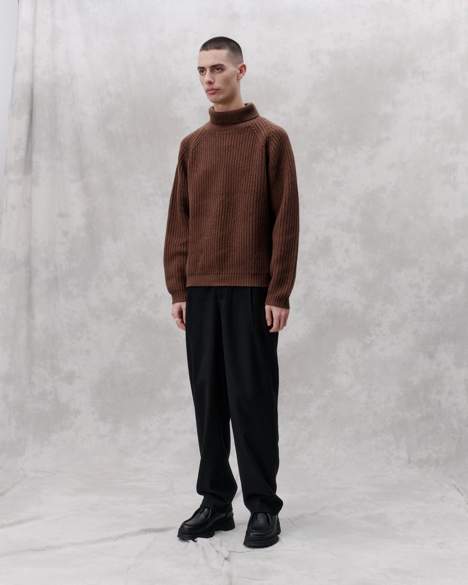 Session is a 5 GG half stitch knitted roll neck jumper made from soft wool. It comes in a relaxed fit with raglan sleeves and one by one ribbed neck and sleeves.