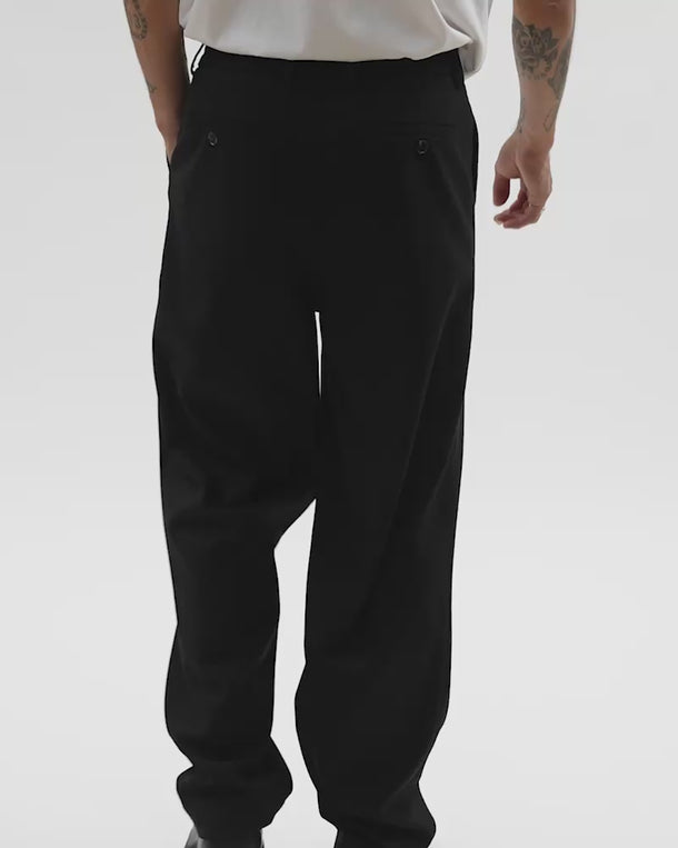 A relaxed everyday essential. The Agency trouser is cut from a heavy twill weave, a staple in our tailoring program and an elevation of our classic Smoke trousers. This full length, wide legged style trouser is perfect to complete a full contemporary suit in interesting silhouettes or simply a shirt or tee. Elasticated waist, center front zip fly and button closure. Welt pockets at the back and slanted pockets at the front.