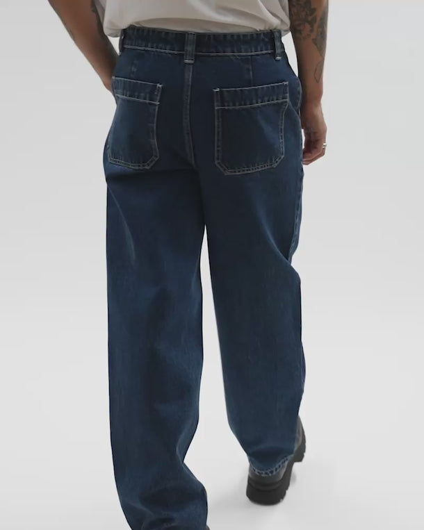 The Alert pants is cut from a denim weave. They have a relaxed fit, front zip fly, button closure and patch pockets at back.