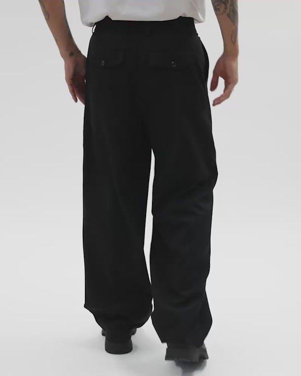 Voluminous, wide and full length fit, with elastic waistband. back pocket flaps and transparent buttons for a clean expression.