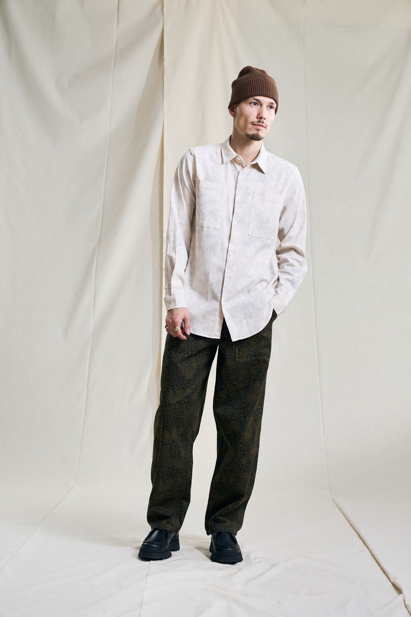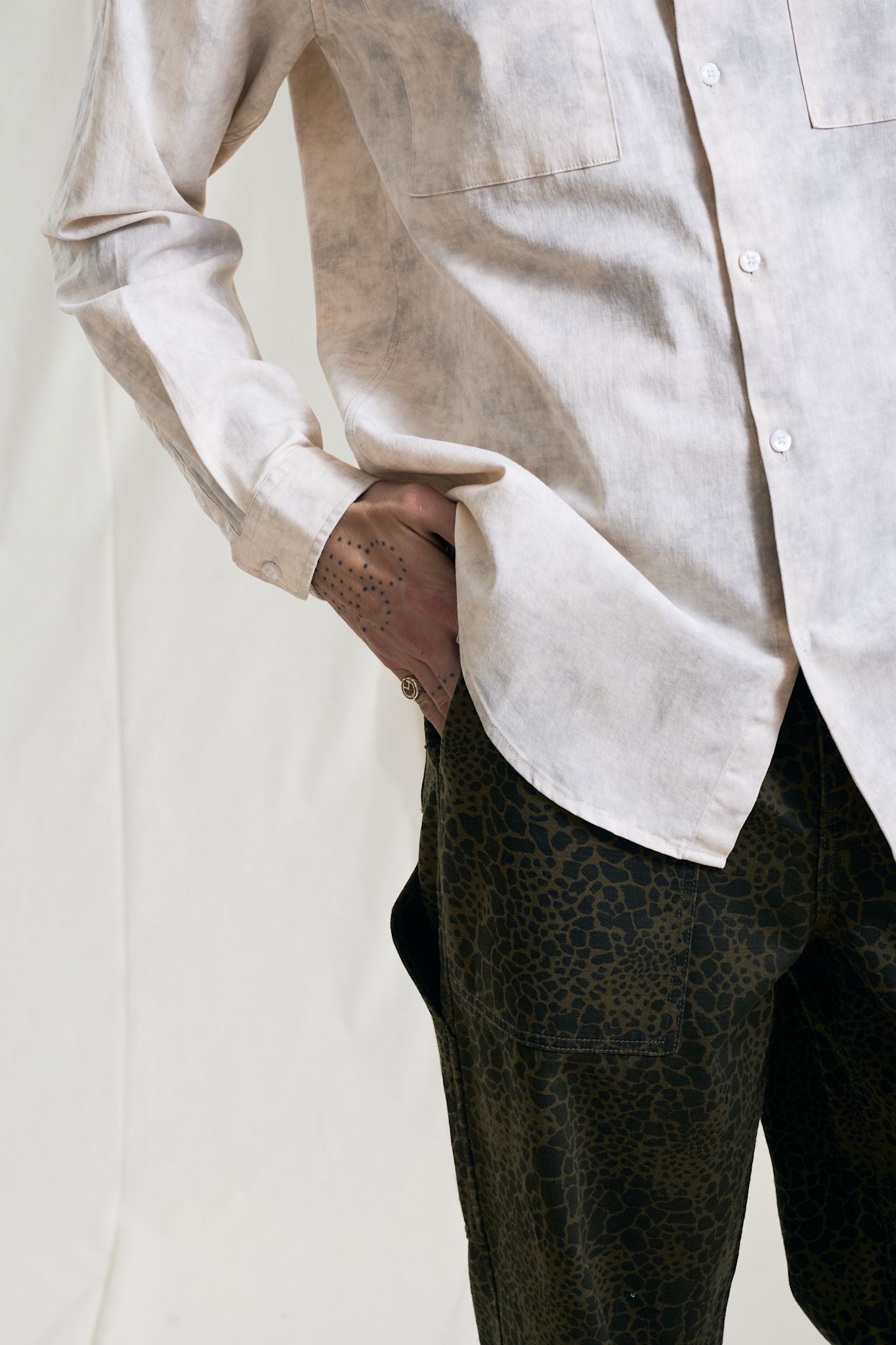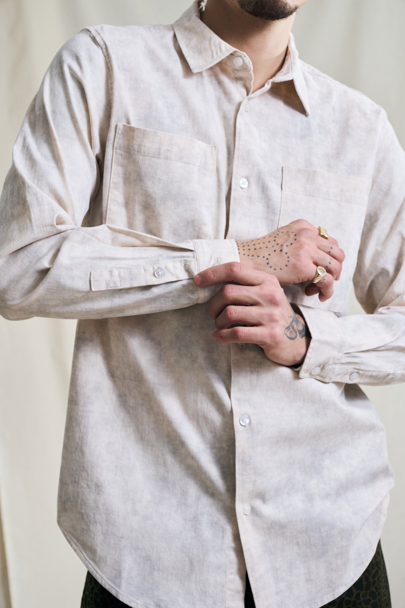 The Canyon shirt is cut from a Korean bleachd out fabric which gives a depth in expression. The fit is regular and the style features two chest pockets, a straight point collar and slightly curved hemline.