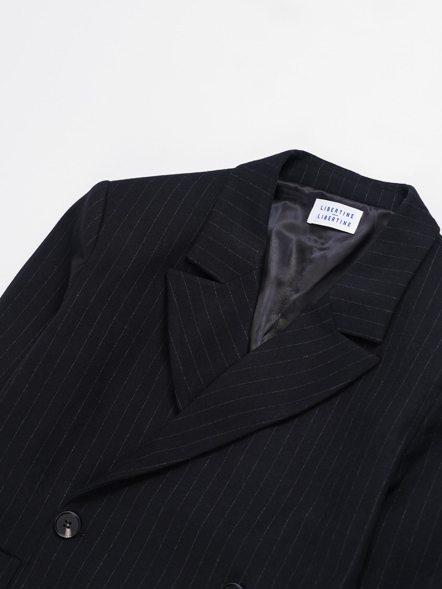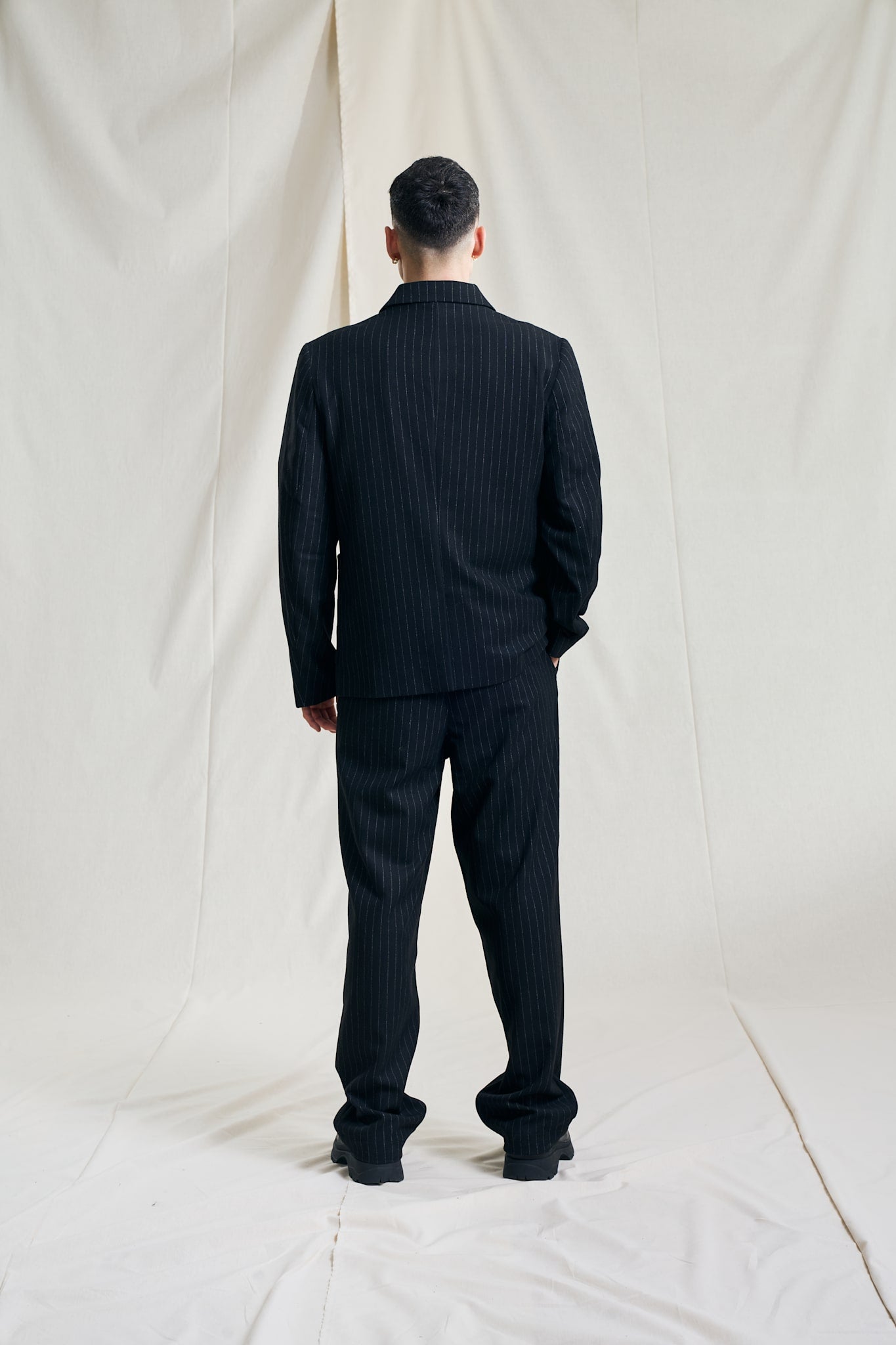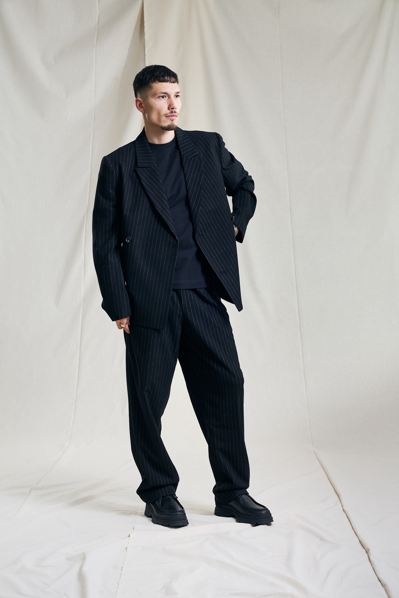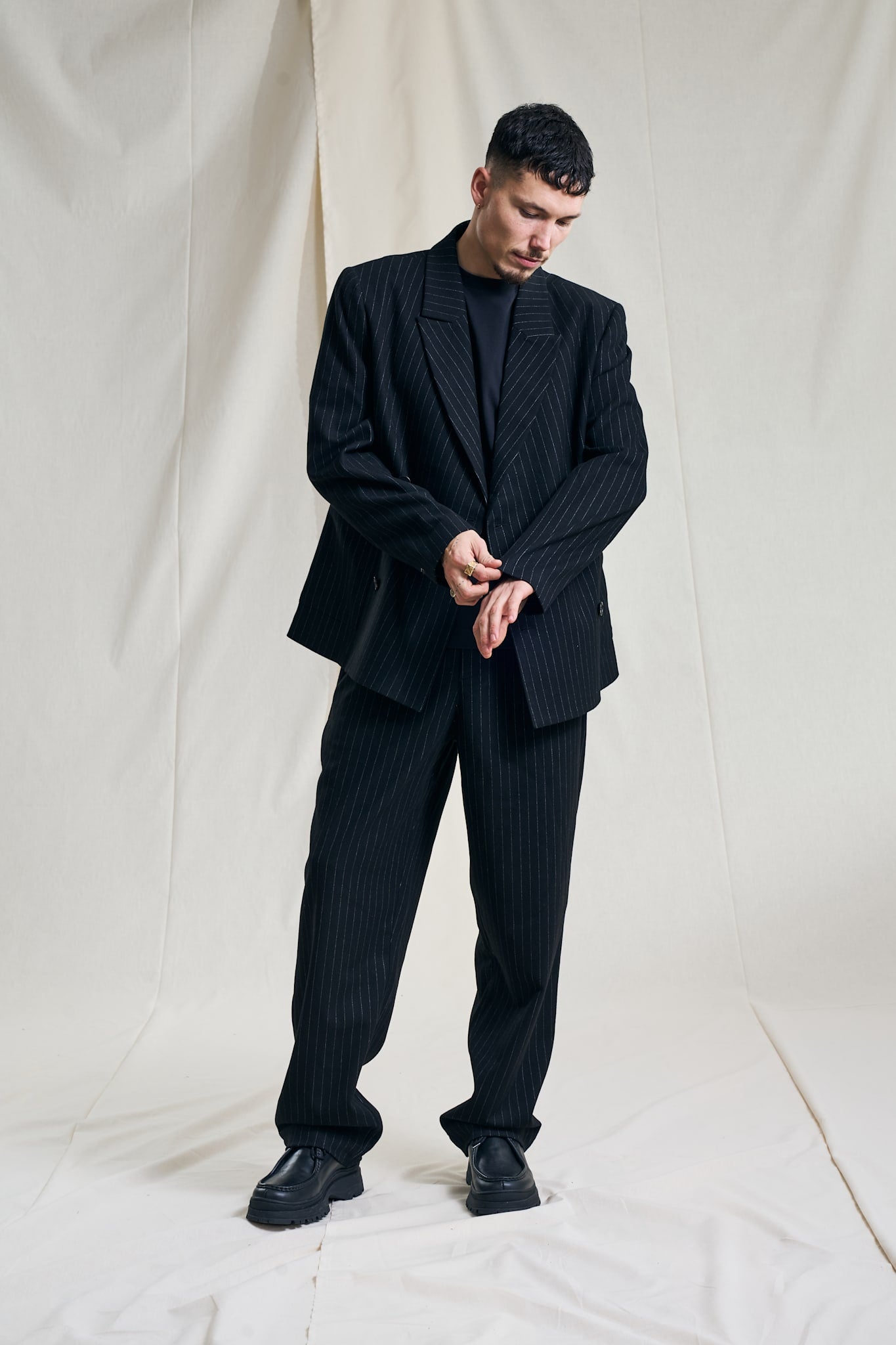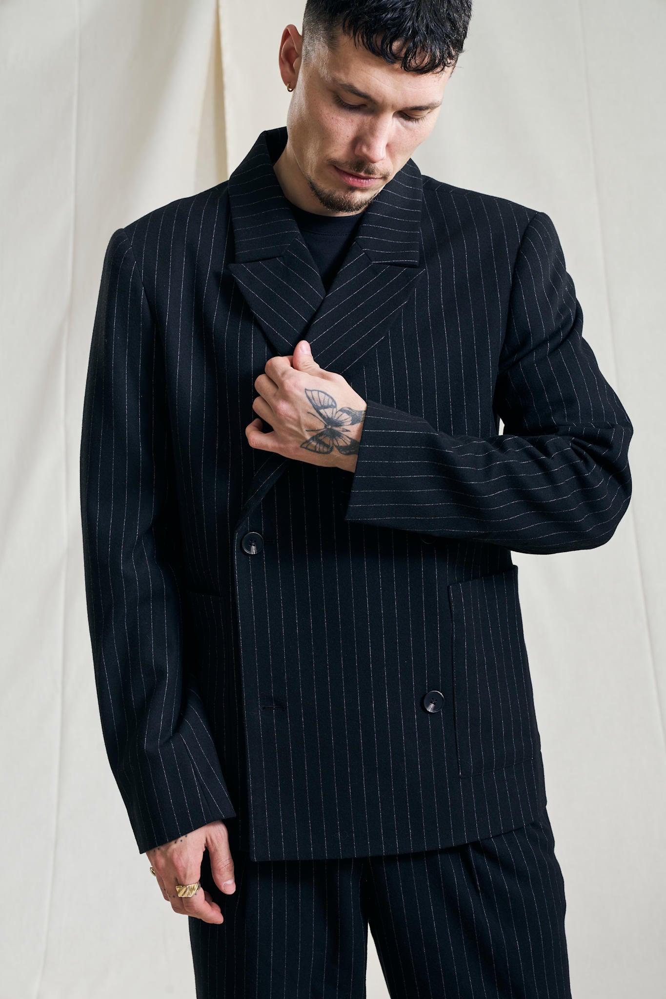 Contemporary tailoring for versatile use. The Public double-breasted suit blazer is a relaxed tailoring option. Slightly boxy fit with a two seamed sleeve, patch pockets, notch lapel and a center back slit opening. The Public blazer is cut from a soft black pin stripe wool blend.