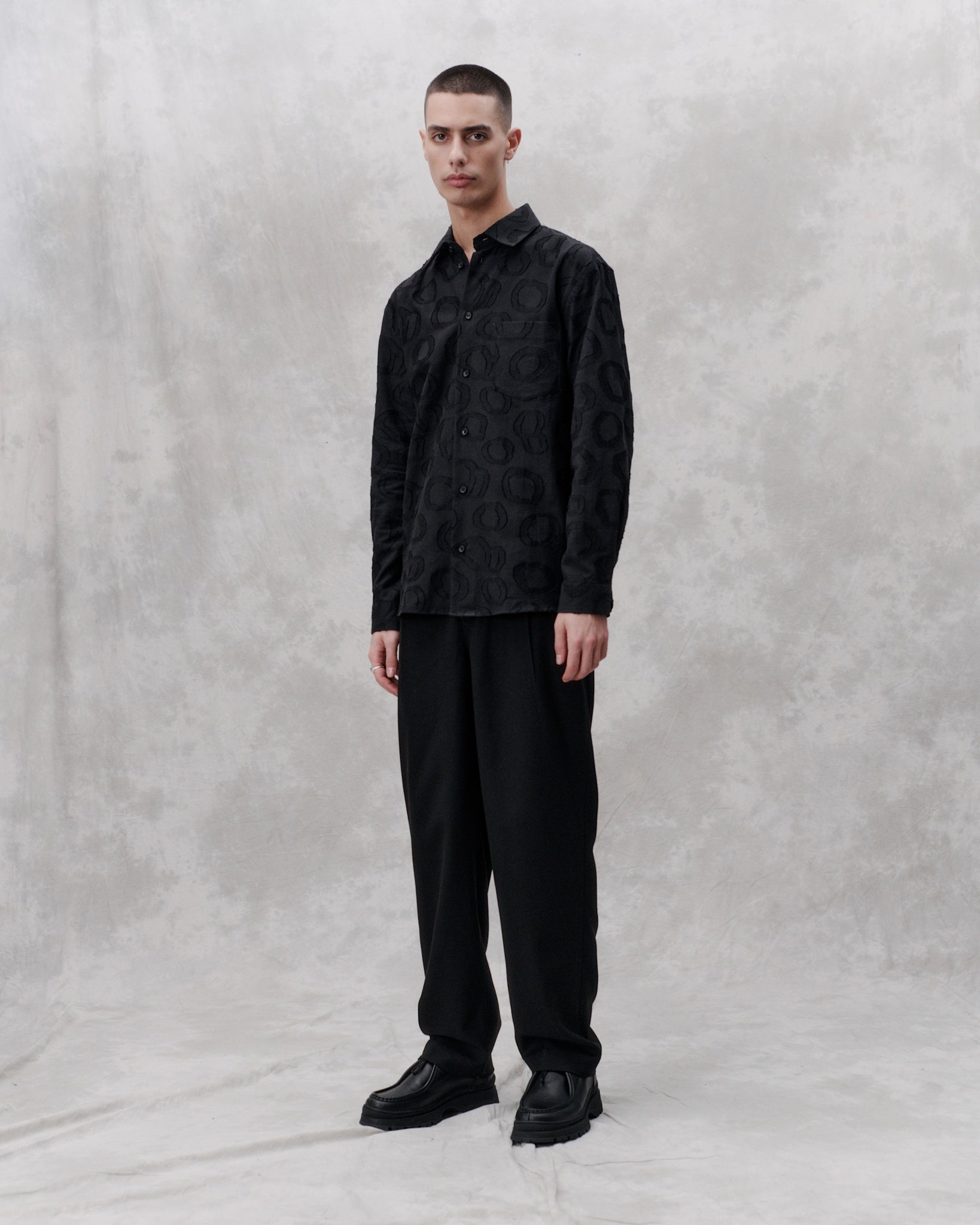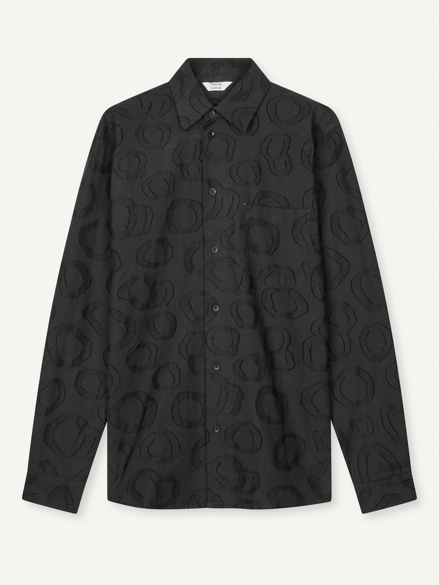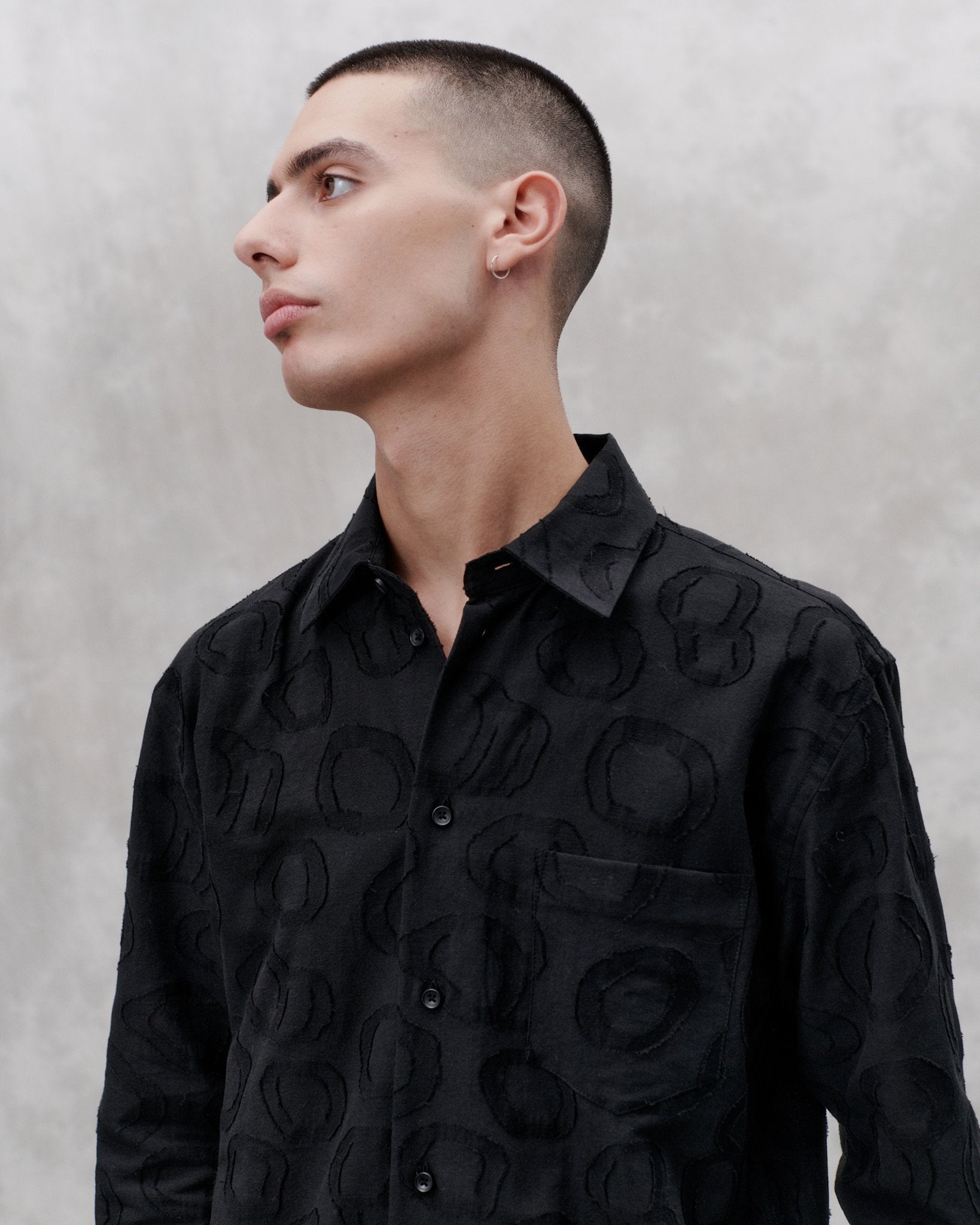 A clean generously fitted shirt with stitchles placket and collar cut from a jacquard cotton. Black buttons on placket and cuffs. This style is ideal for completing a laid back suit look.