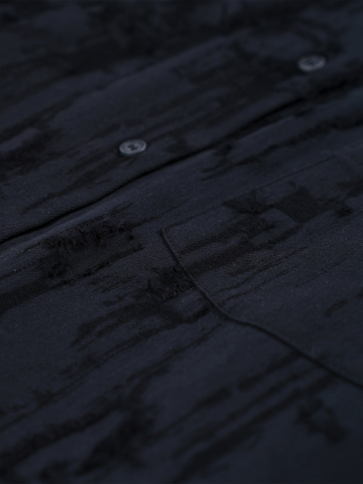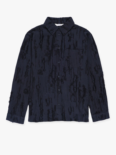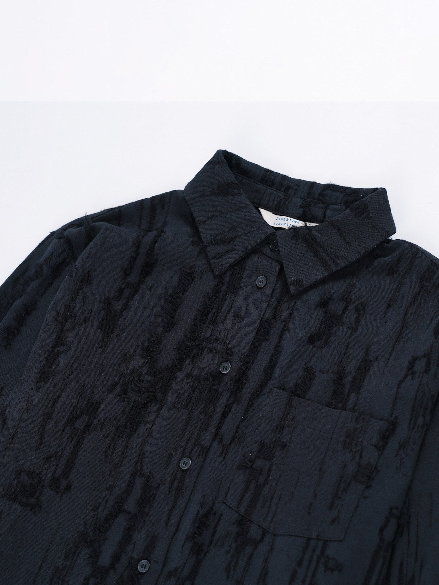 A clean, generously fitted shirt with stitchless placket and collar. Cut from a soft, signature “fil de coupe” fabric giving the shirt a distinct torn look. Button closure on placket and cuffs.