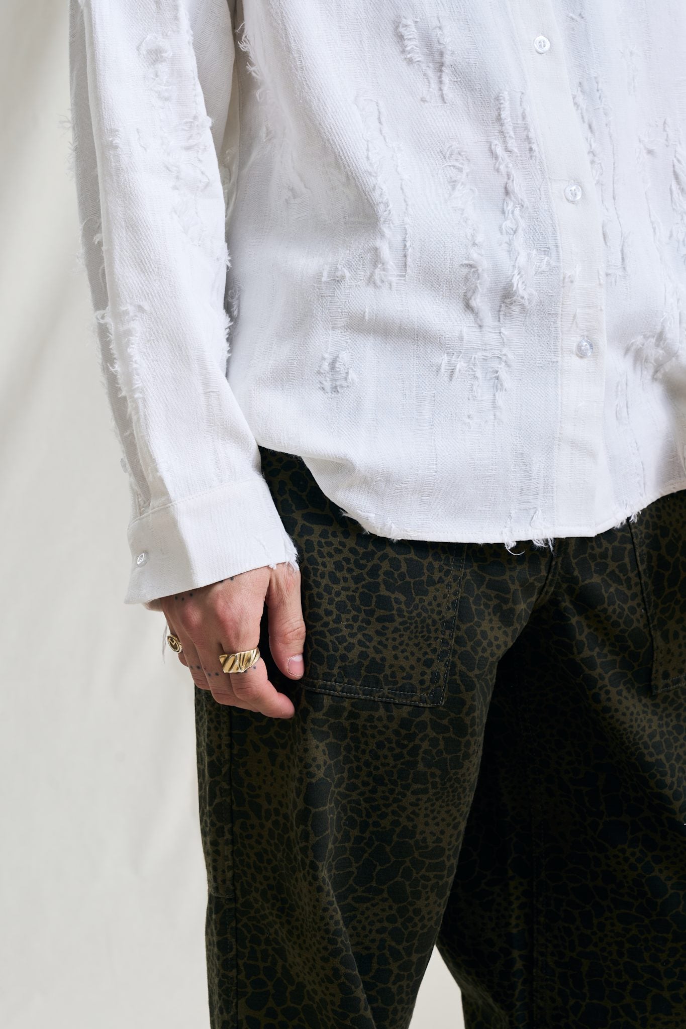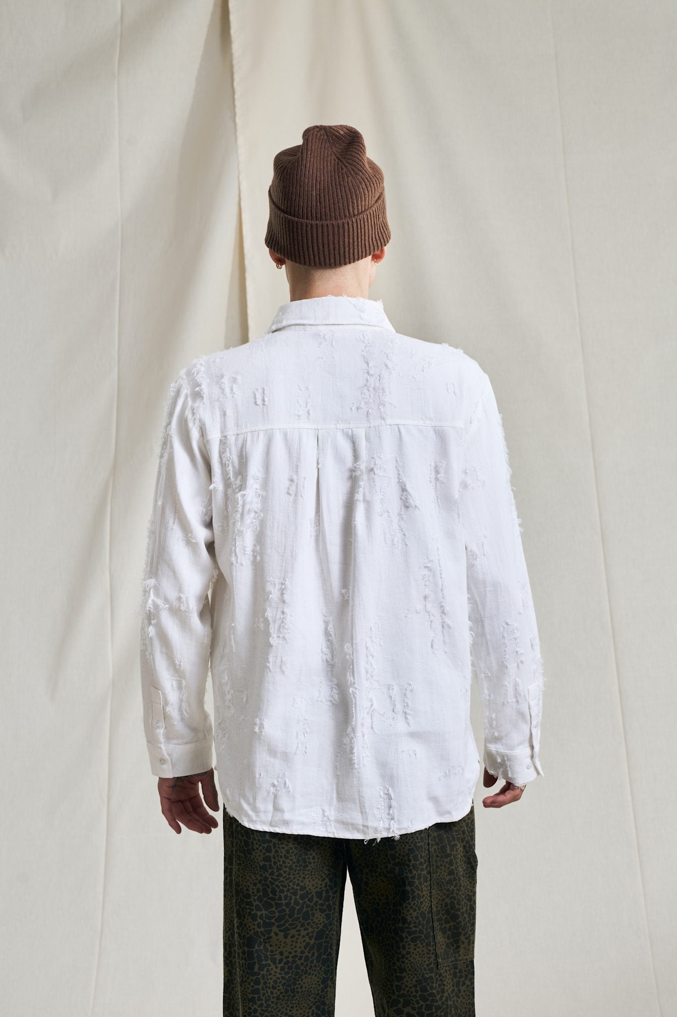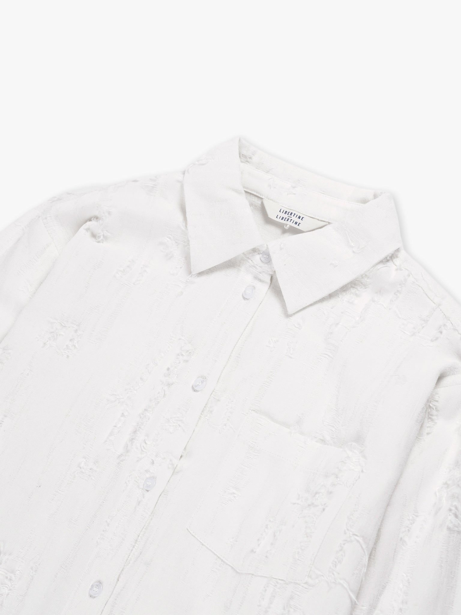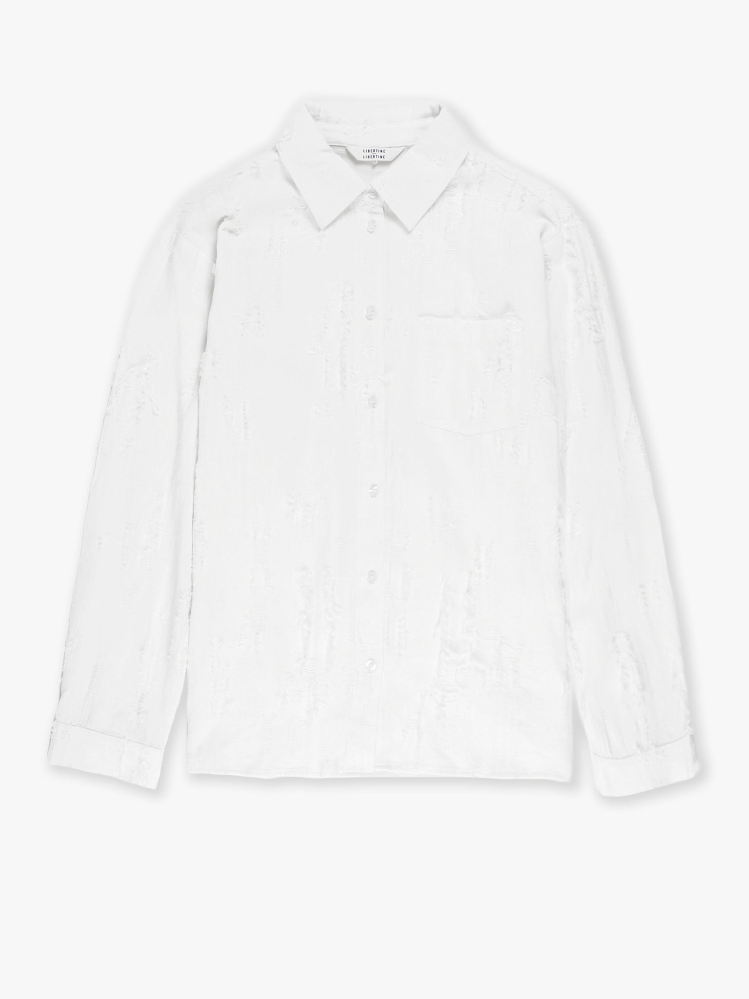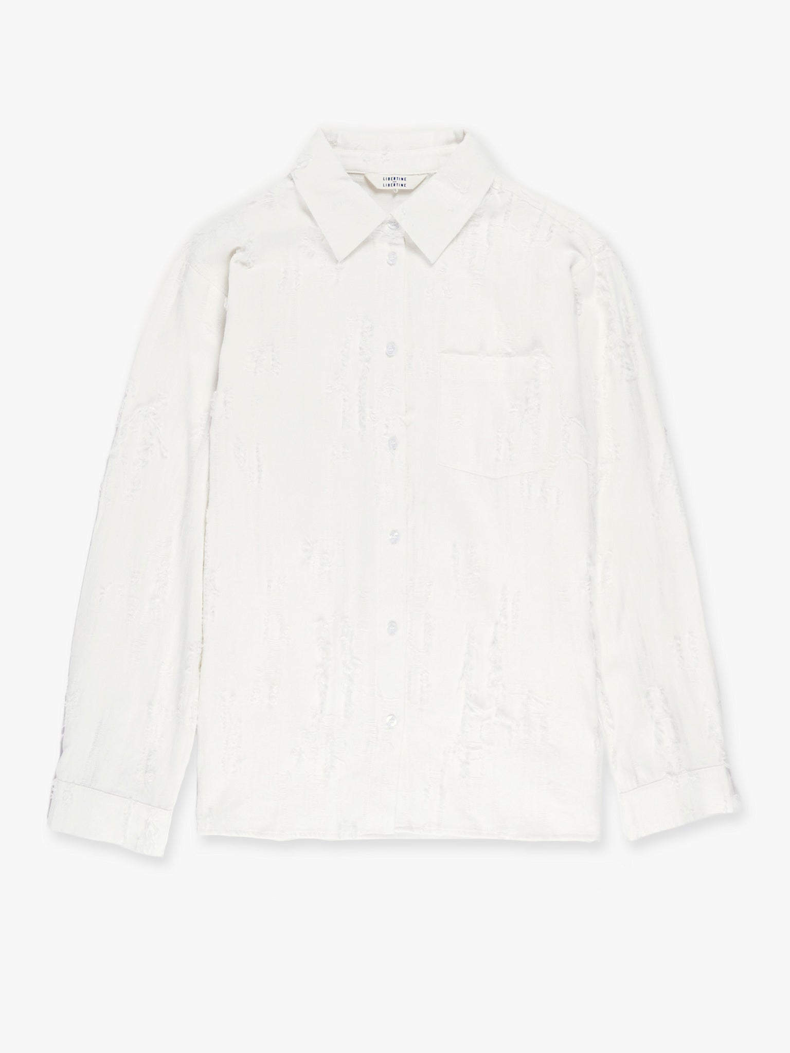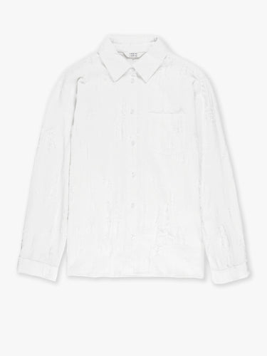 A clean, generously fitted shirt with stitchless placket and collar. Cut from a soft, signature “fil de coupe” fabric giving the shirt a distinct torn look. Button closure on placket and cuffs.