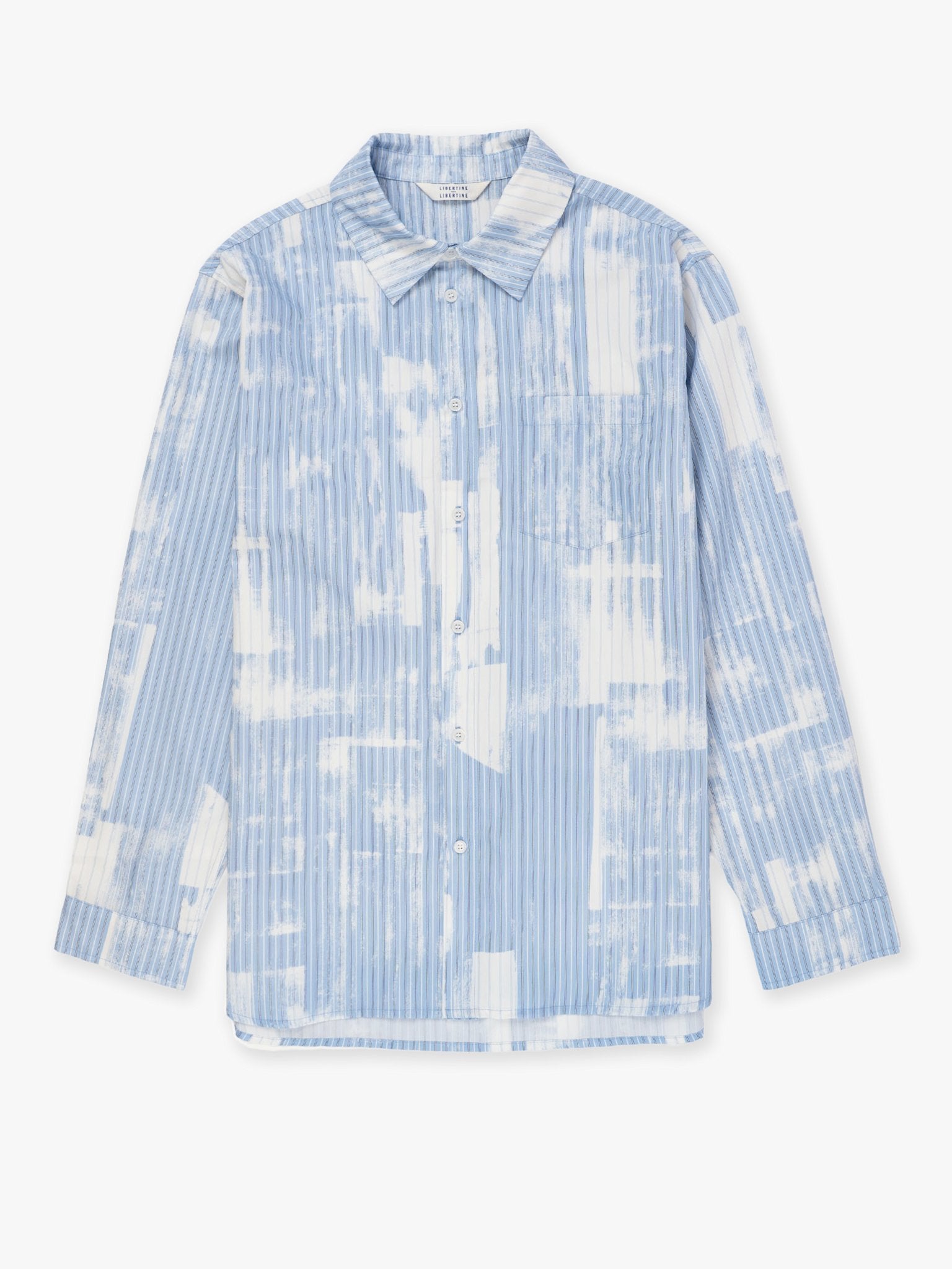 Record is a generously fitted shirt with stitchless placket and collar.
