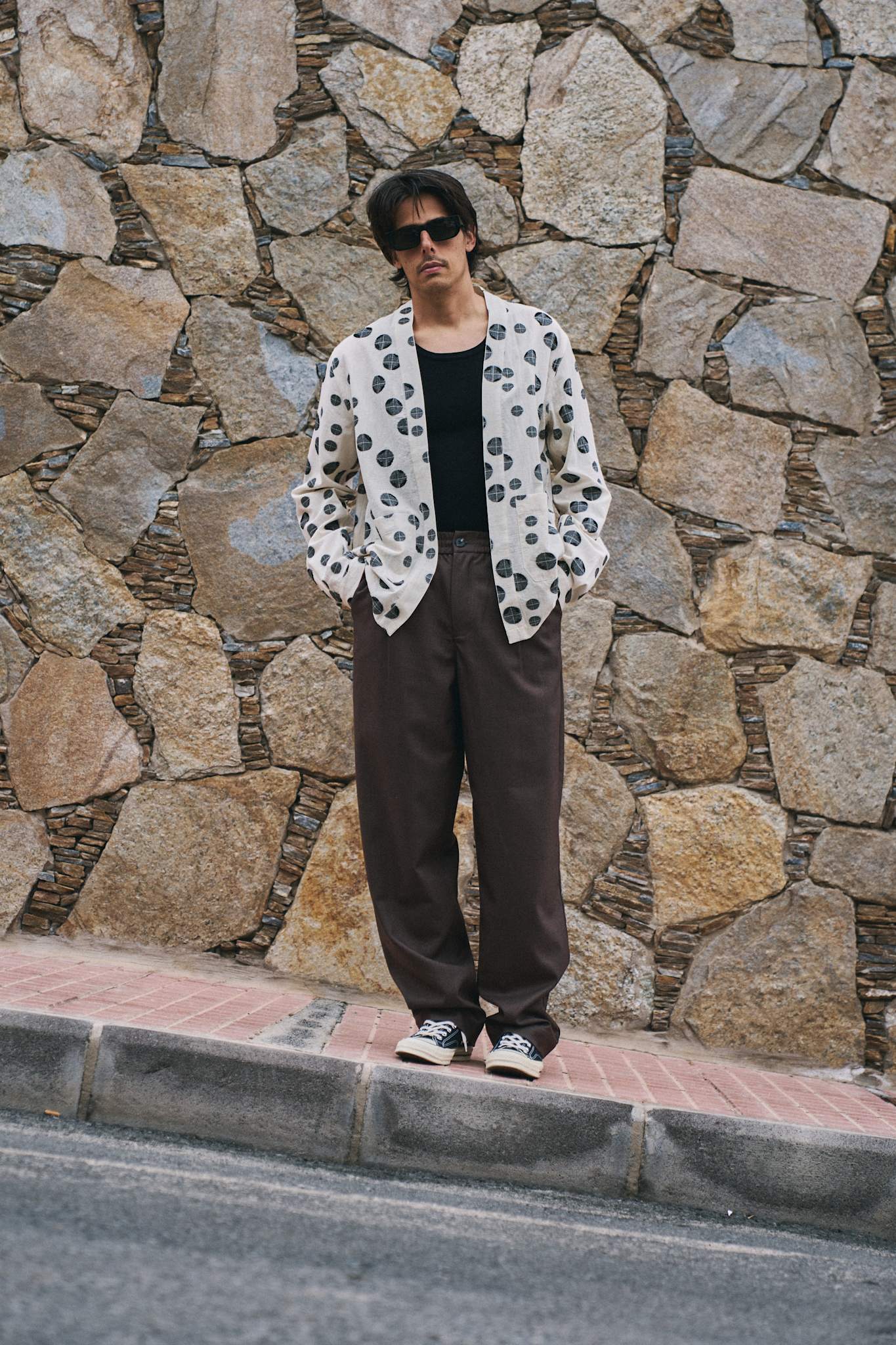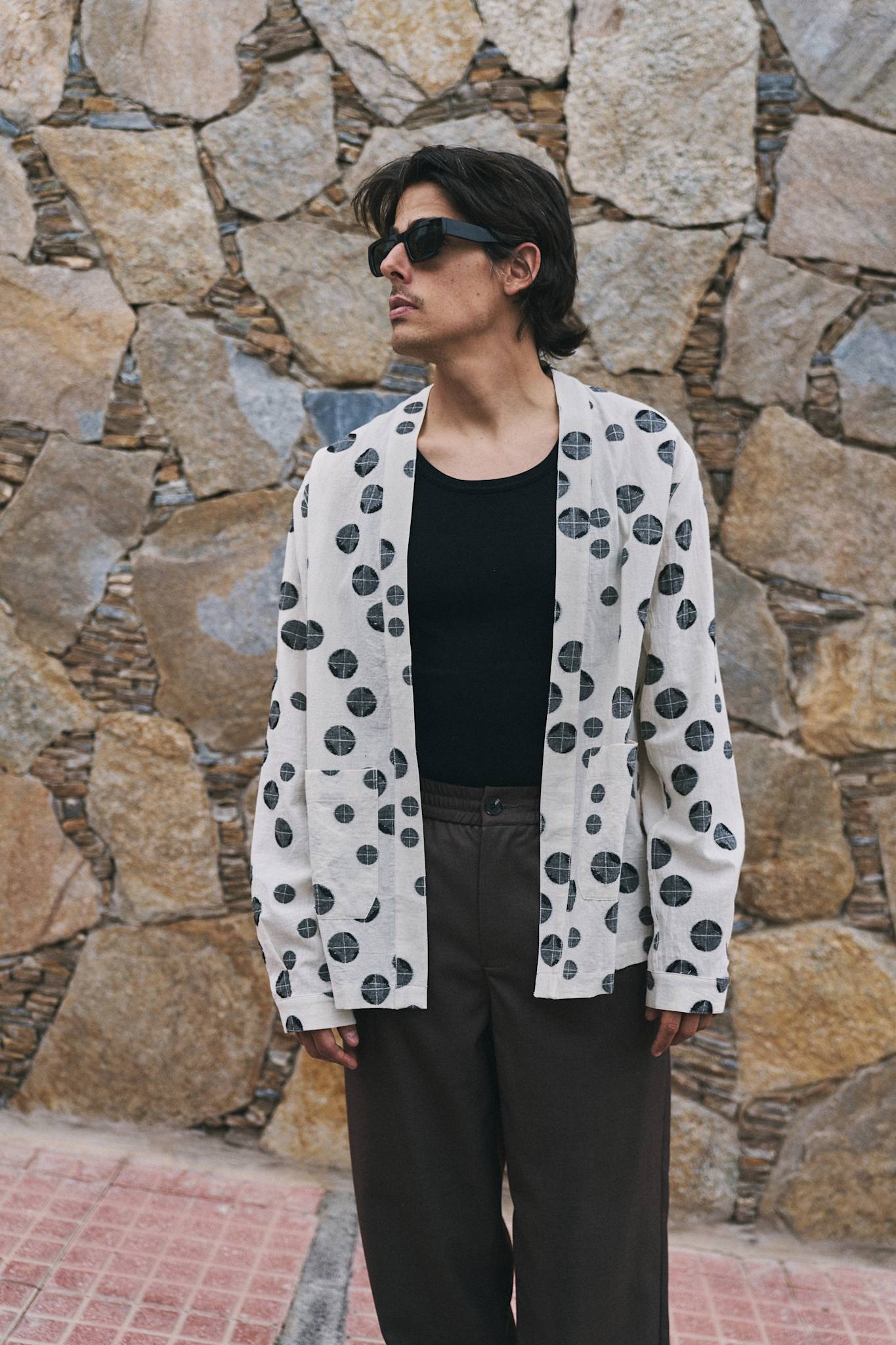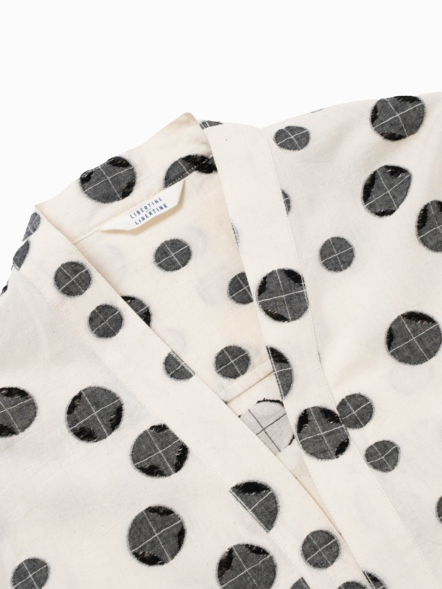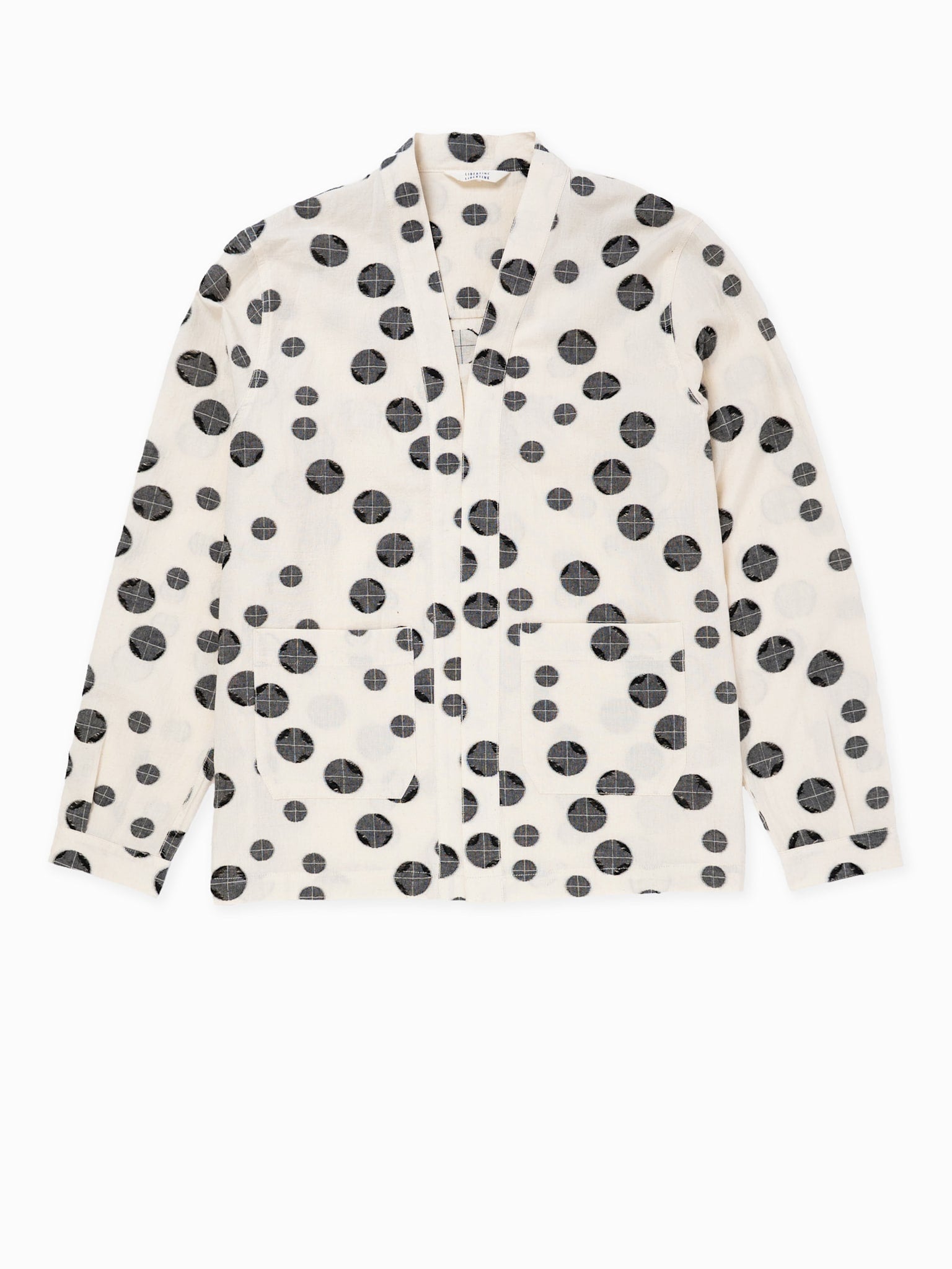 Two front pockets and cut from a distinct jacquard dot weaved fabric.